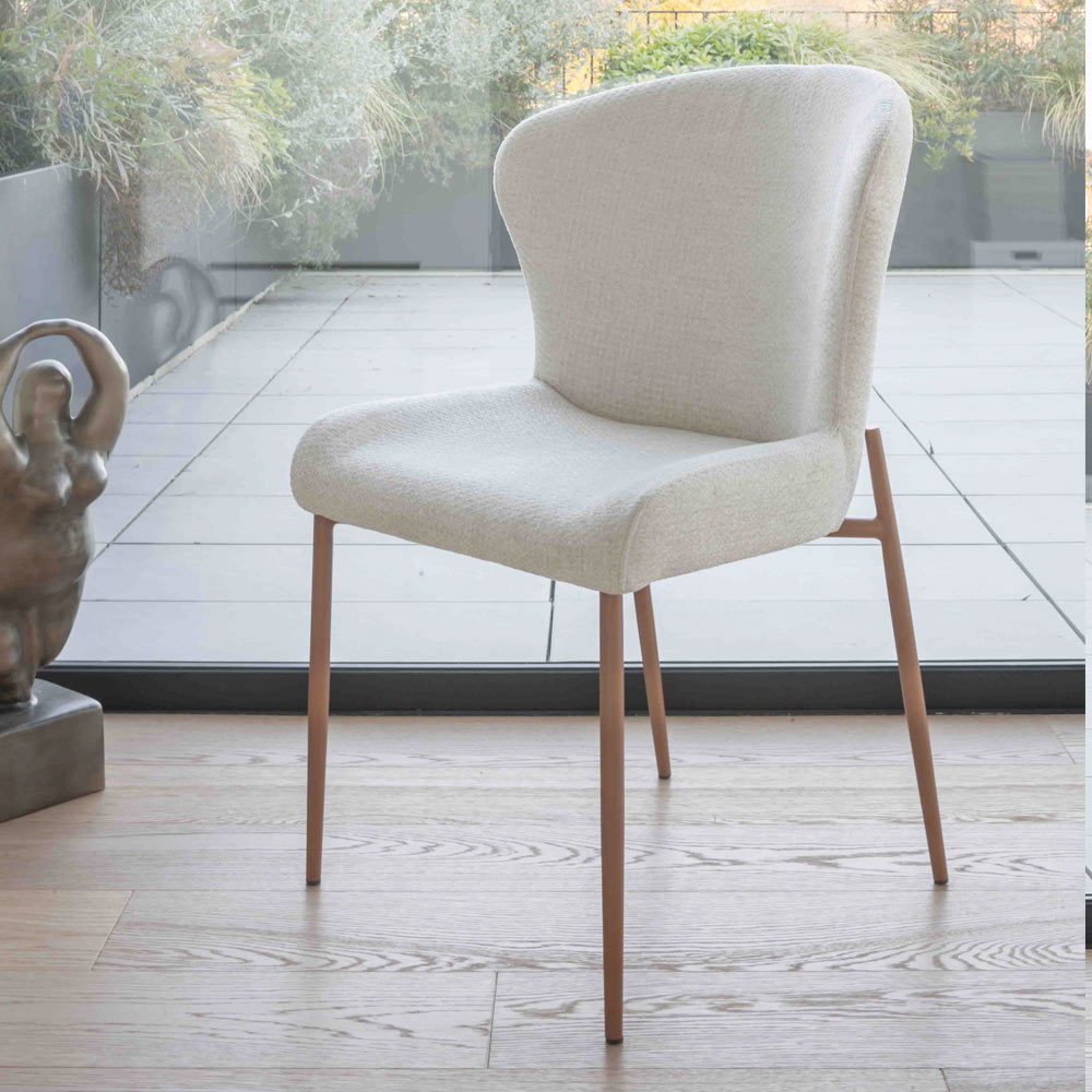 Esta silla combina a la perfección comodidad envolvente y diseño sofisticado , ideal para espacios modernos de estilo refinado. El asiento acolchado y el respaldo curvo ofrecen un soporte ergonómico que invita a la relajación, mientras que la tapicería de tela aporta un toque de luminosidad y suavidad a la estancia. Las patas de metal pintado , con un perfil delgado y armonioso, crean un elegante contraste con la textura de la tela, realzando la ligereza y la contemporaneidad del diseño.