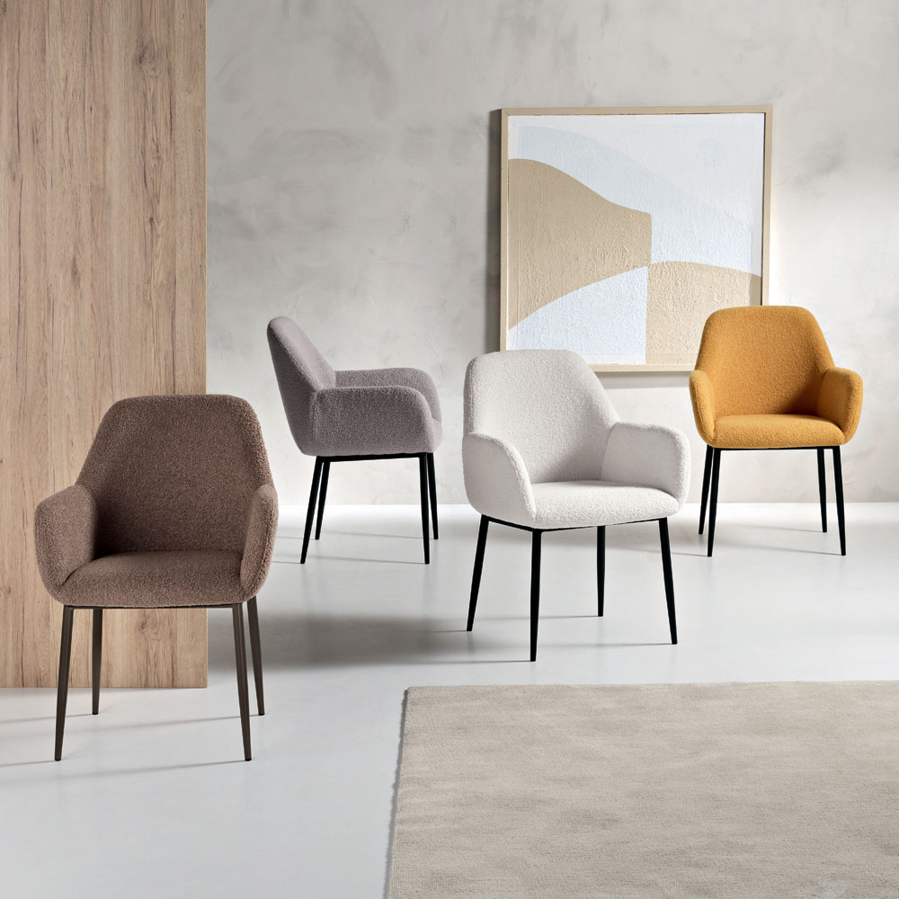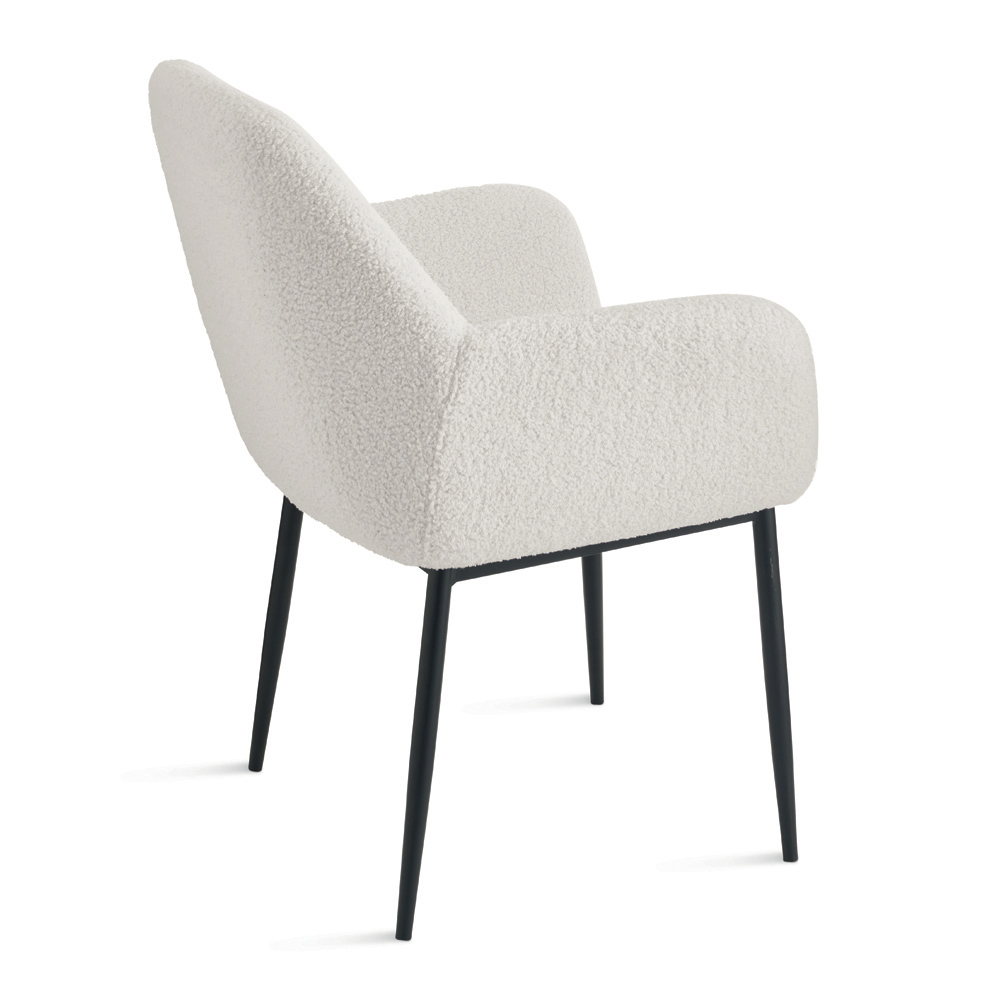 La silla cuenta con un asiento amplio y cómodo con reposabrazos integrados , creando una forma geométrica compacta diseñada para ofrecer mayor comodidad en el uso diario. El tejido bouclé realza la suavidad del asiento, logrando un equilibrio perfecto entre estética y funcionalidad.