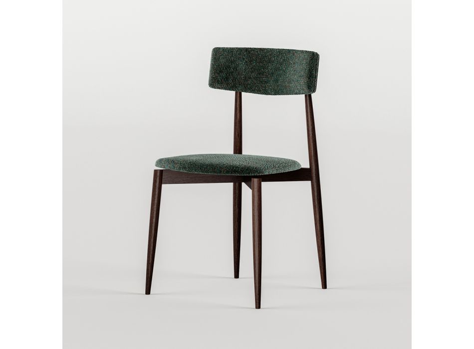 4 sillas de salón fabricadas en madera maciza de fresno con asiento moldurado y acolchado, tapizado en tejido desenfundable. El respaldo es de madera curvada en la parte posterior, acolchado y tapizado en tela en la parte delantera con costura de cordón en el borde. La unión entre el respaldo y la estructura es de metal pulido. Práctico y versátil es la combinación de minuciosos procesos manuales y el uso de máquinas de última generación. La atención al detalle, desde el detalle metálico en el respaldo hasta la forma especial de las patas, pasando por las combinaciones con tejidos exclusivos, la convierten en una silla refinada y con carácter.