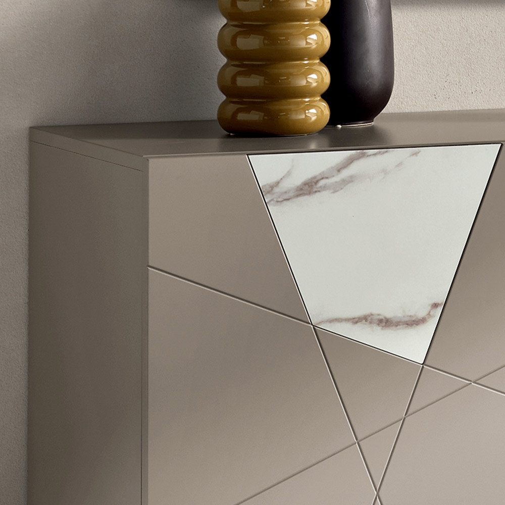 La estructura está compuesta por un marco de madera revestido de melamina y puertas de MDF pantografiadas , con grabados decorativos que se entrecruzan en un elegante diseño geométrico. Los insertos de vidrio con efecto mármol enriquecen la superficie, creando una sofisticada interacción entre gráficos y materiales.