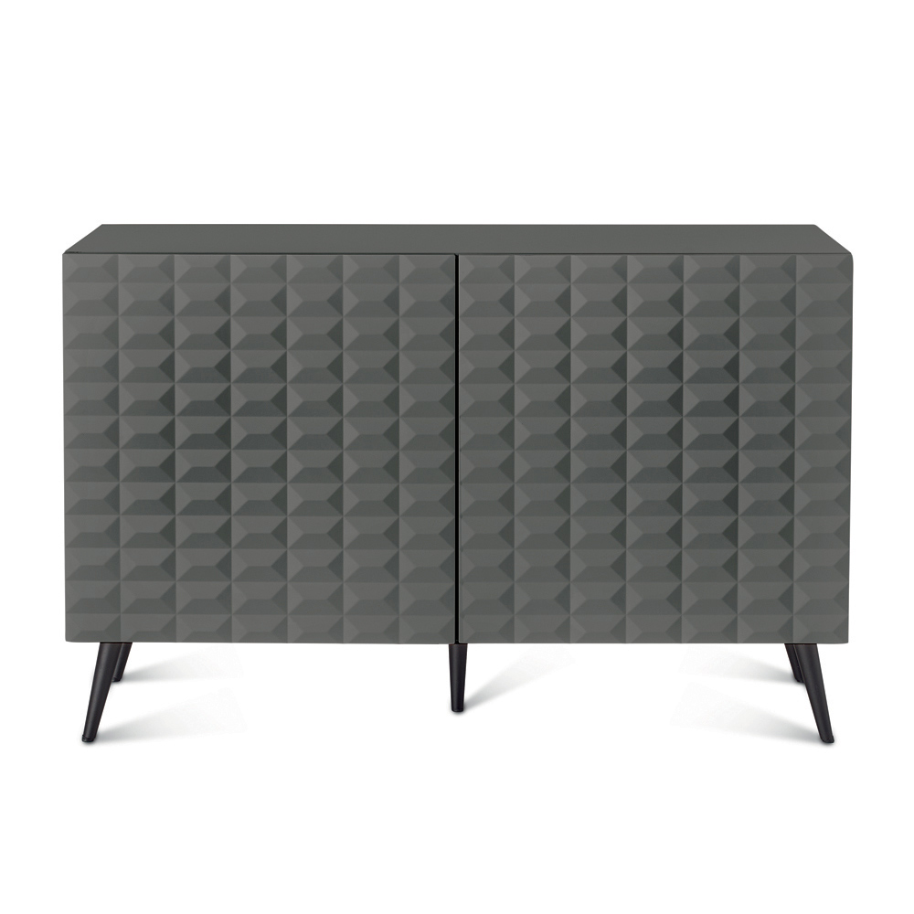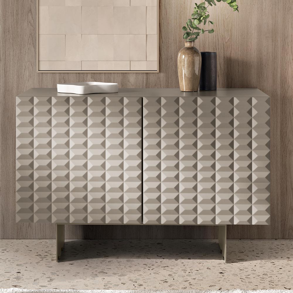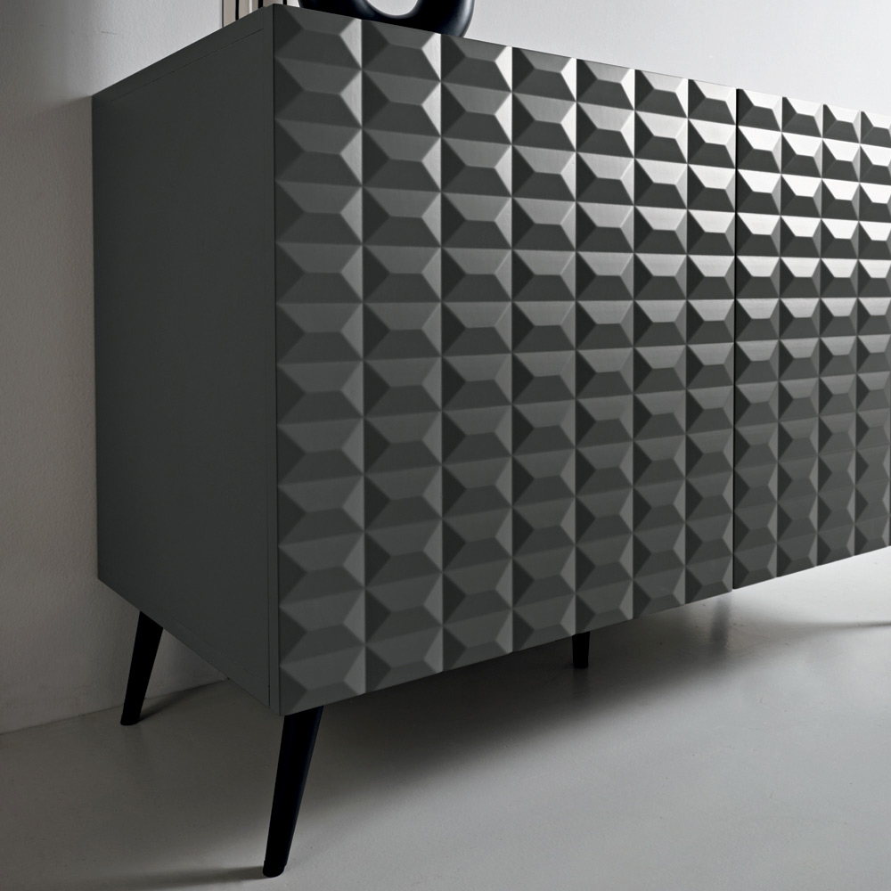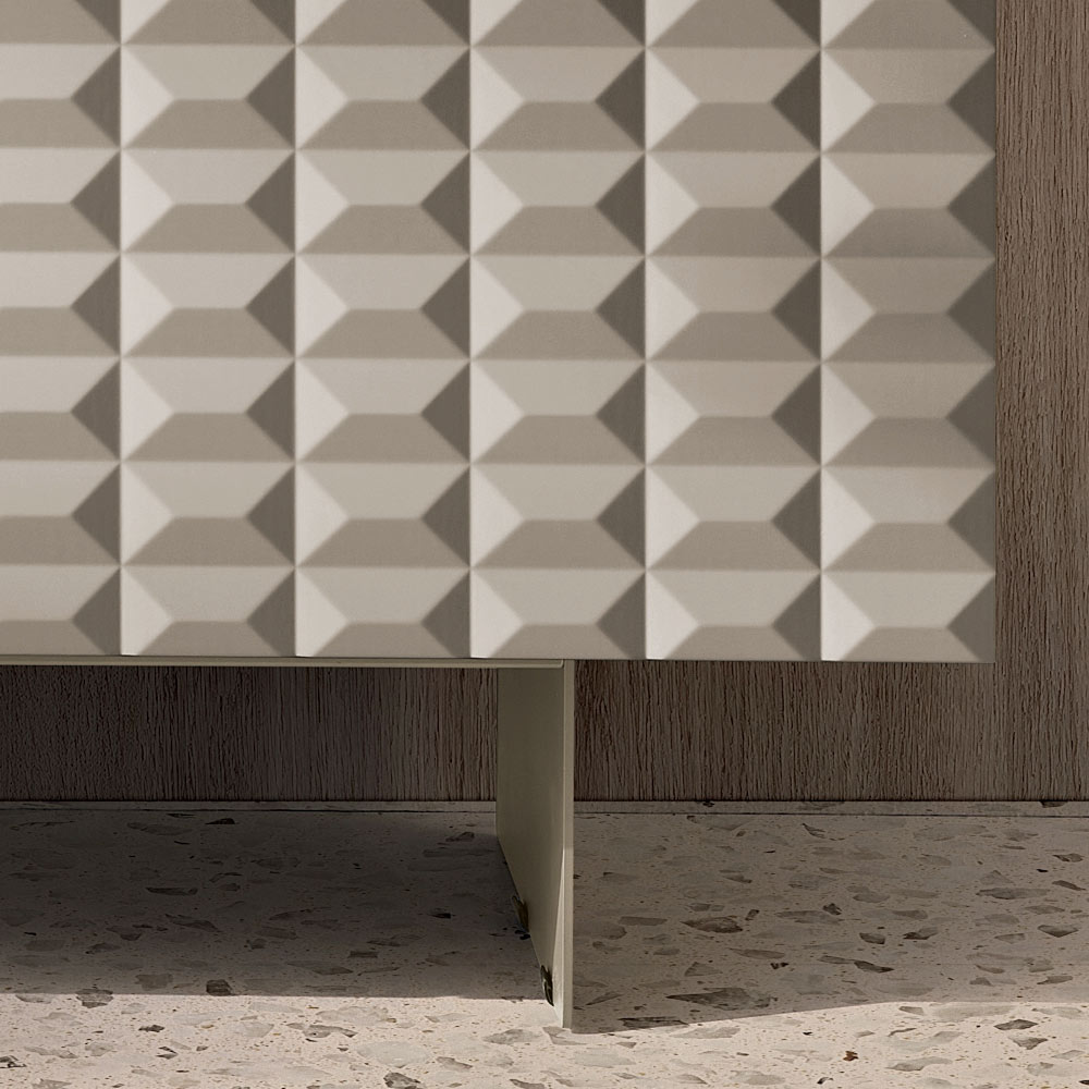 Las puertas de MDF revestidas de PVC presentan una textura geométrica tridimensional que recuerda a los famosos relieves de rombos , creando un fascinante juego de luces y sombras. Este detalle añade profundidad visual y convierte al aparador en el centro de atención de la habitación.