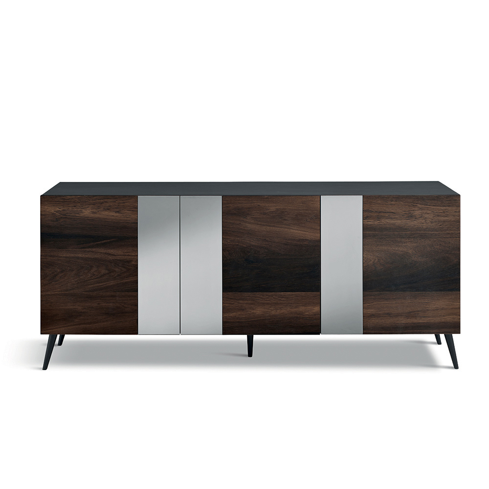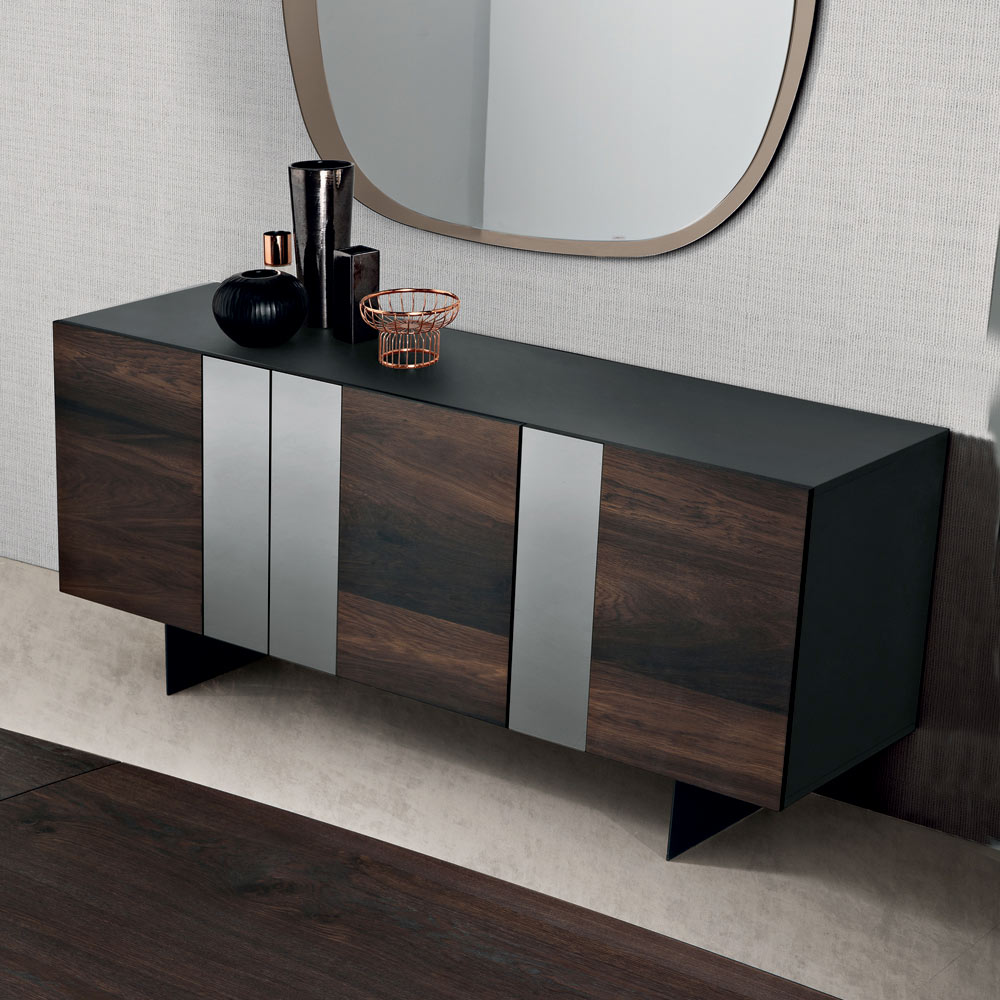 El cuerpo revestido de melamina color antracita alberga puertas de chapa de roble , con inserciones verticales de cristal espejado que estilizan visualmente la composición. Este contraste entre la textura de la madera y los reflejos del espejo aporta profundidad y dinamismo, dotando al aparador de elegancia y dinamismo.