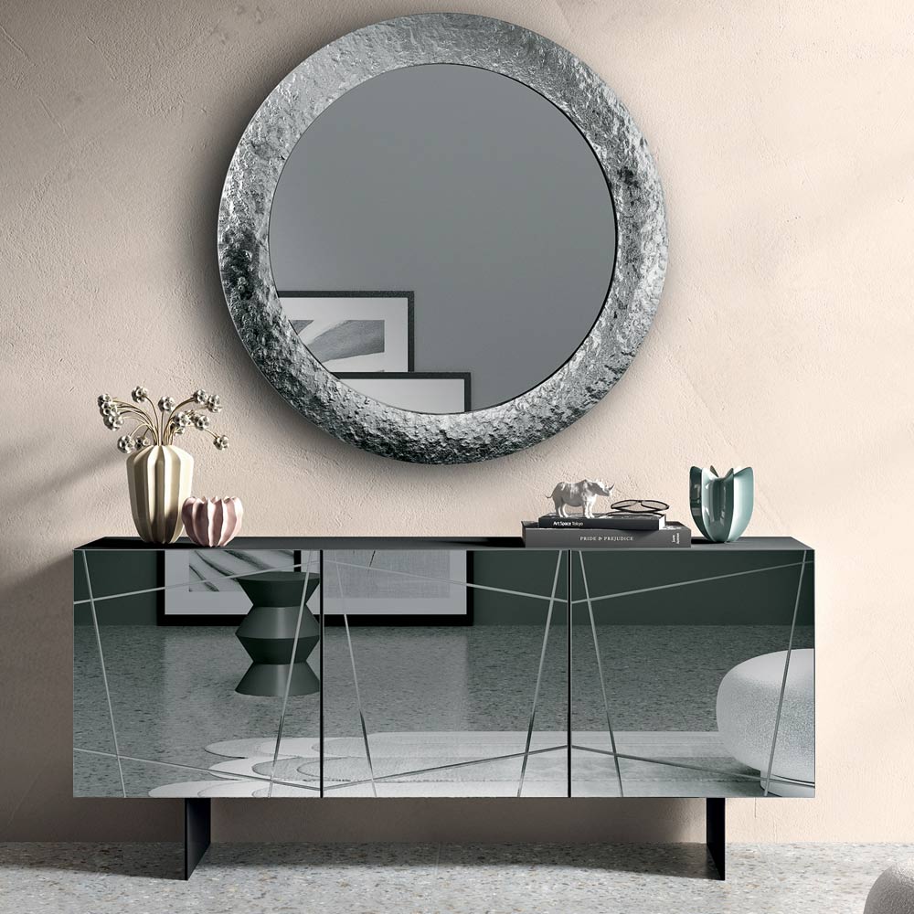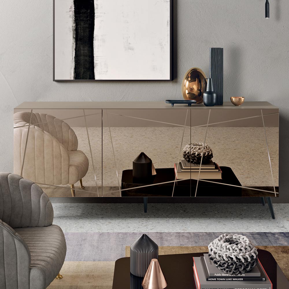 El cuerpo de melamina alberga puertas revestidas de bronce o cristal ahumado espejado , adornadas con grabados decorativos que se entrelazan en un elegante diseño gráfico. Este detalle realza la superficie reflectante, creando un refinado juego de luces y profundidad.