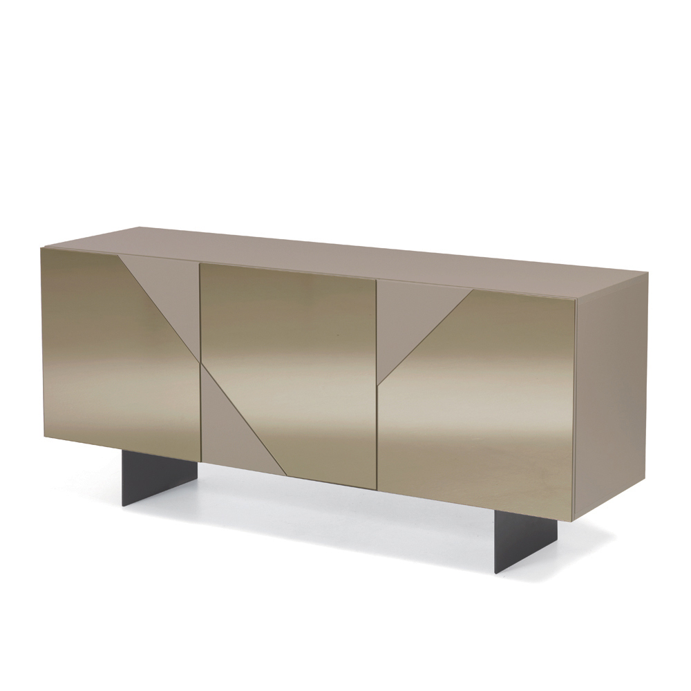 Las puertas de MDF están revestidas con cristal espejado que alterna superficies brillantes y mates , creando un refinado juego geométrico que captura la luz y aporta profundidad visual. Este contraste de materiales confiere al aparador un aspecto elegante y dinámico, ideal para espacios modernos y sofisticados.