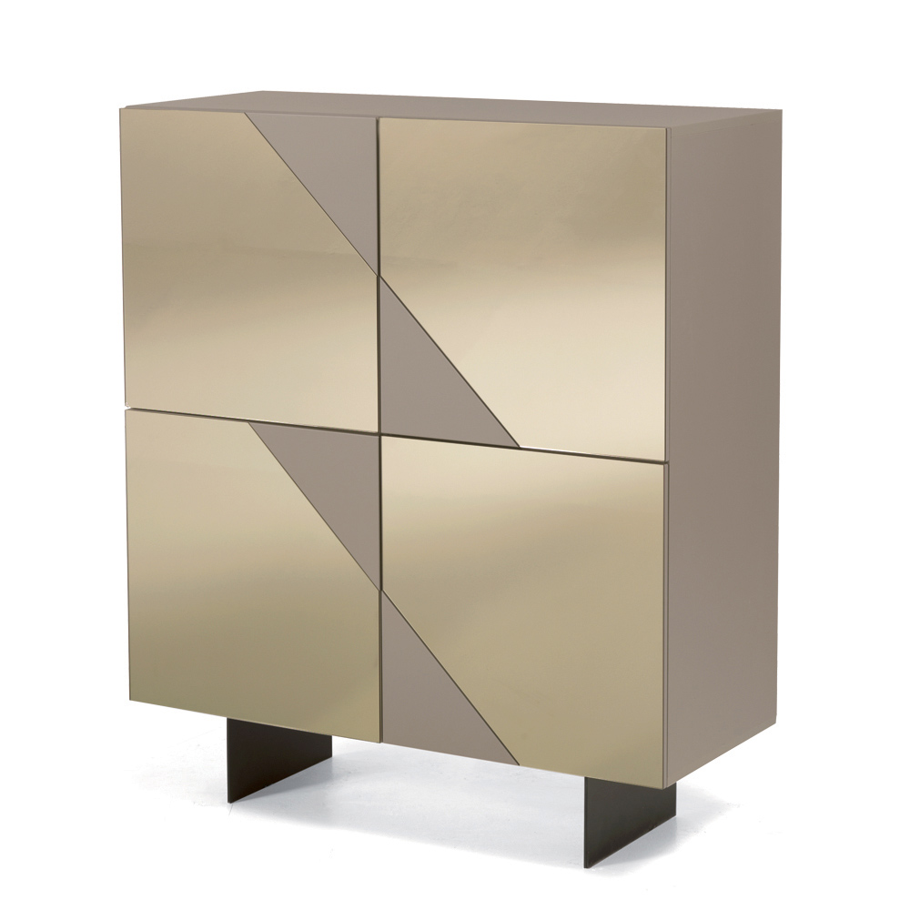 Aparador de diseño fabricado en Italia con puertas de cristal espejado y base metálica.