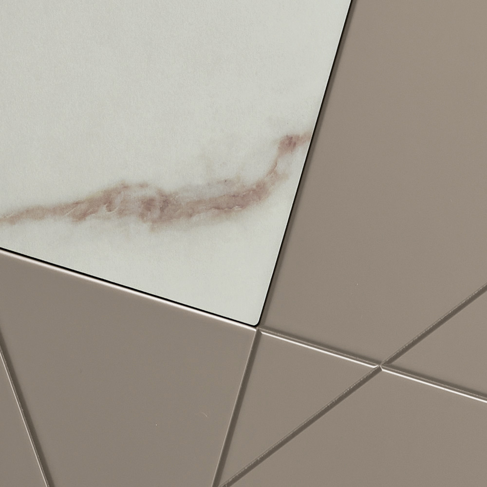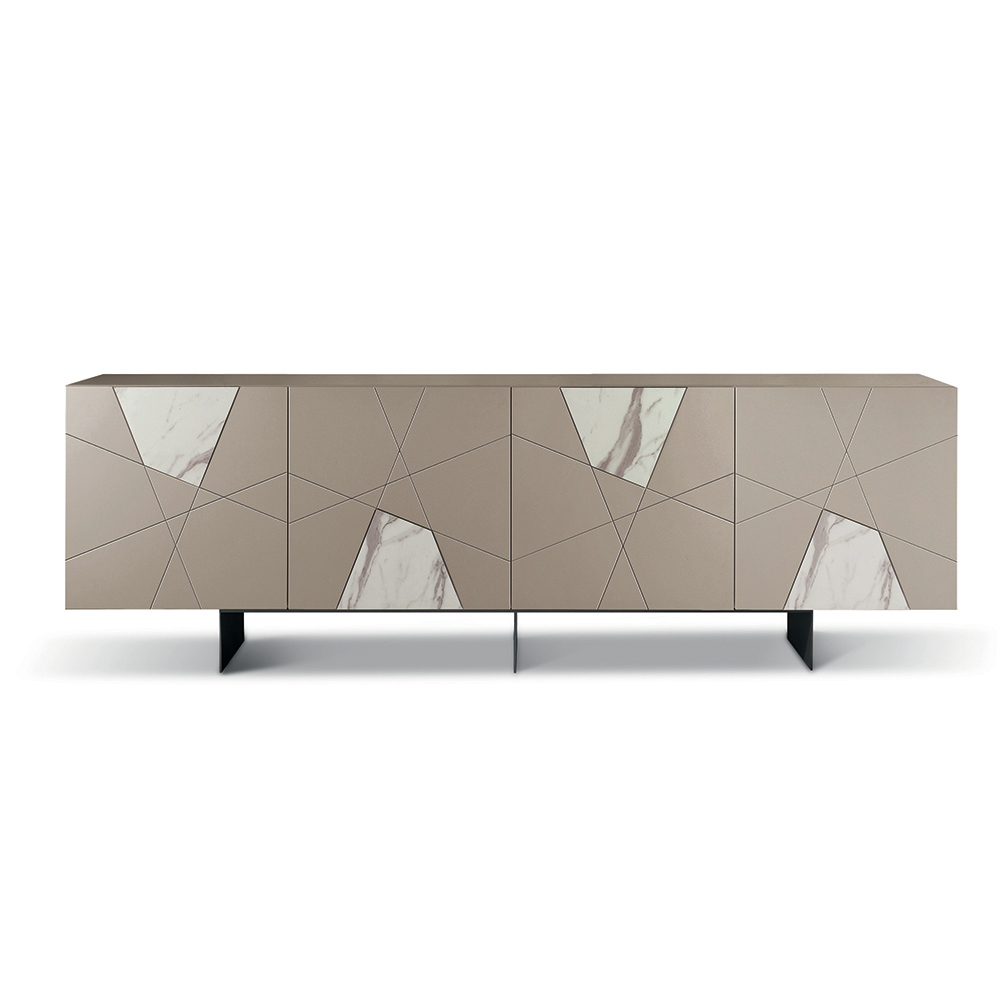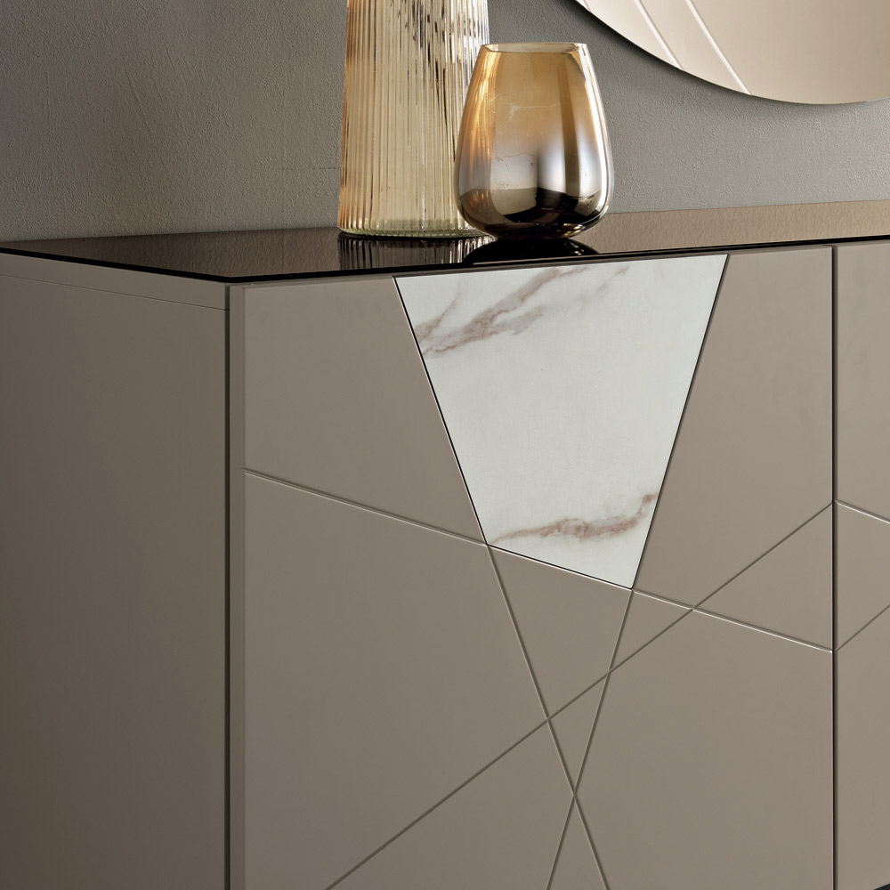 La estructura está compuesta por una carcasa de madera revestida de melamina, una tapa de cristal espejado y puertas de MDF pantografiadas, con grabados decorativos que se entrelazan en un elegante diseño geométrico. Inserciones de cristal con efecto mármol enriquecen la superficie, creando una sofisticada interacción entre gráficos y materiales.