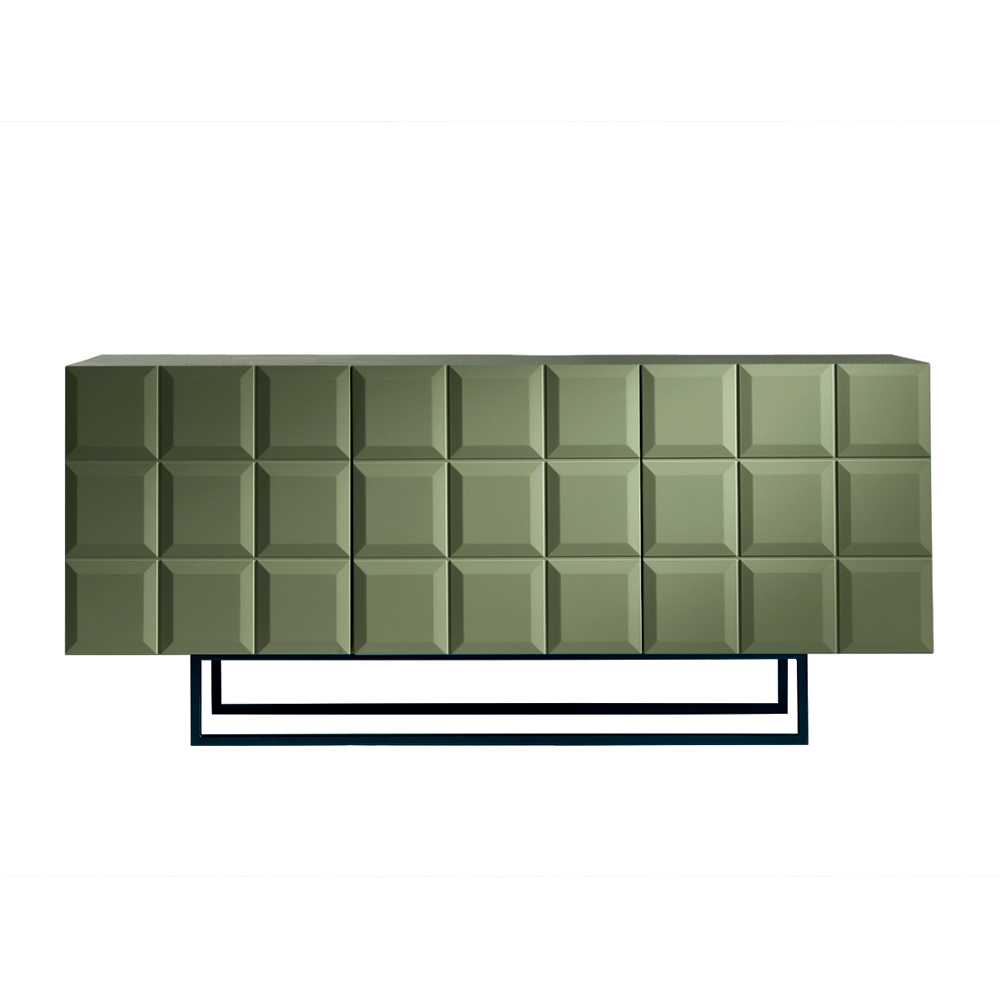 Aparador de diseño fabricado en Italia con puertas geométricas en relieve y base metálica.