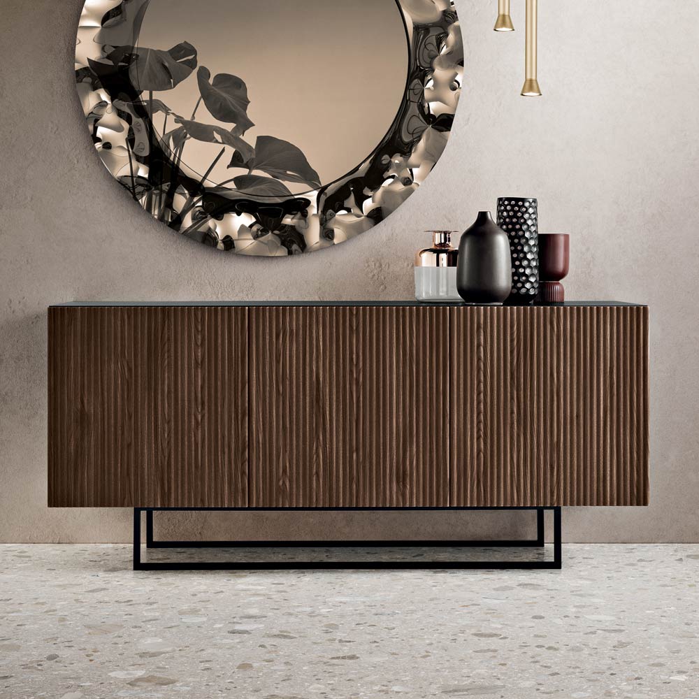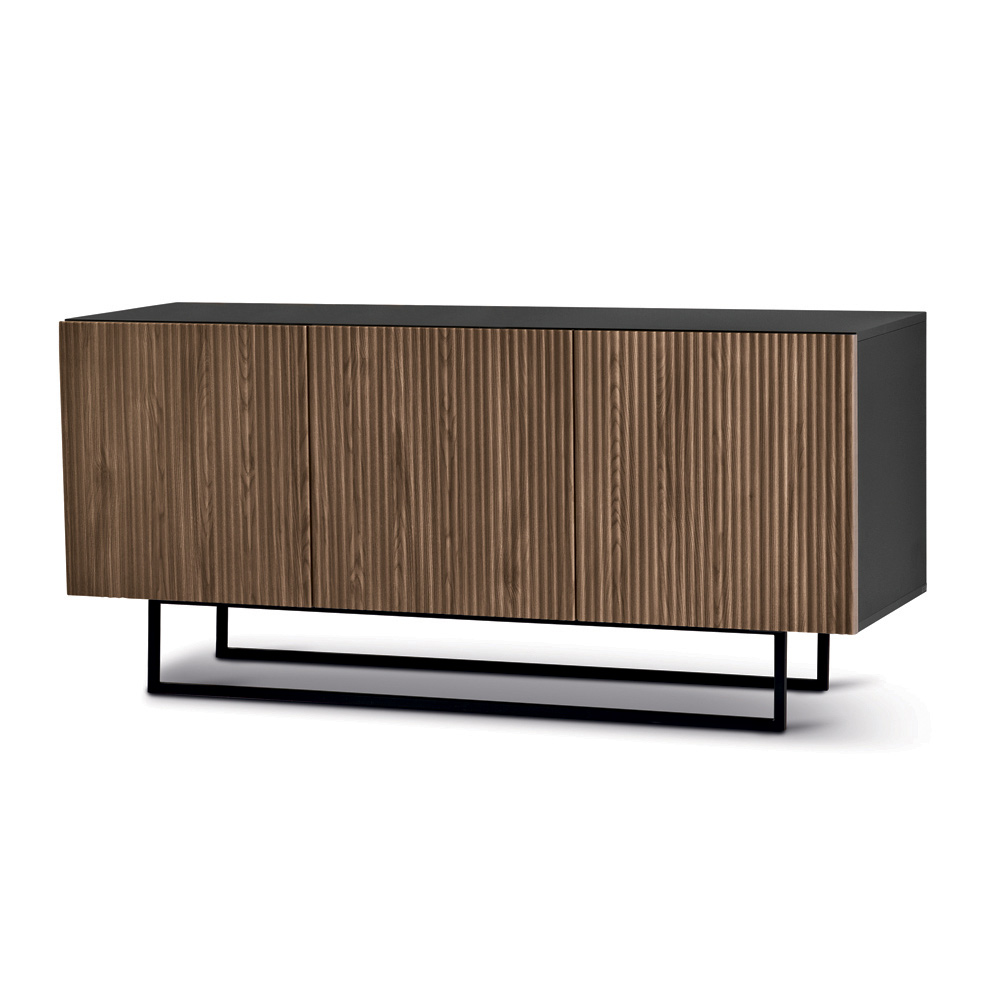 La estructura se completa con una base de metal pintado , disponible en diferentes configuraciones, que aporta ligereza visual y dinamismo al mueble, manteniendo un equilibrio perfecto entre solidez y elegancia.
