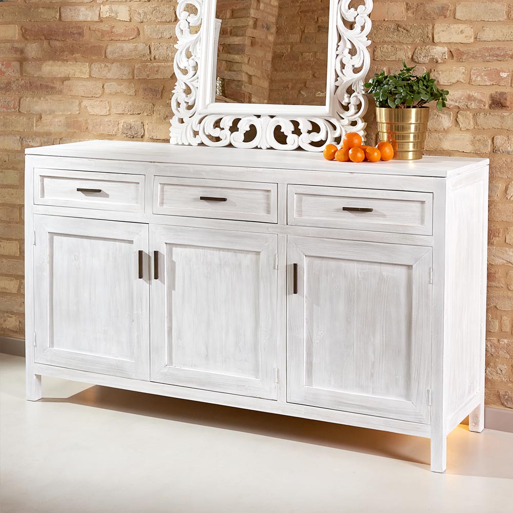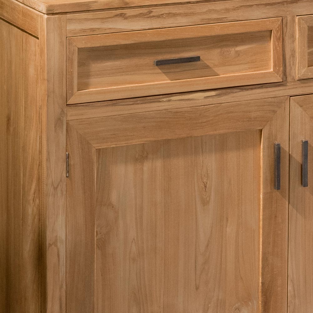 Este aparador de teca maciza es una pieza atemporal y auténtica, ideal para realzar espacios como la cocina, el comedor o la sala de estar. La veta natural de la madera y su artesanía aportan calidez y elegancia, haciendo que cada pieza sea única.