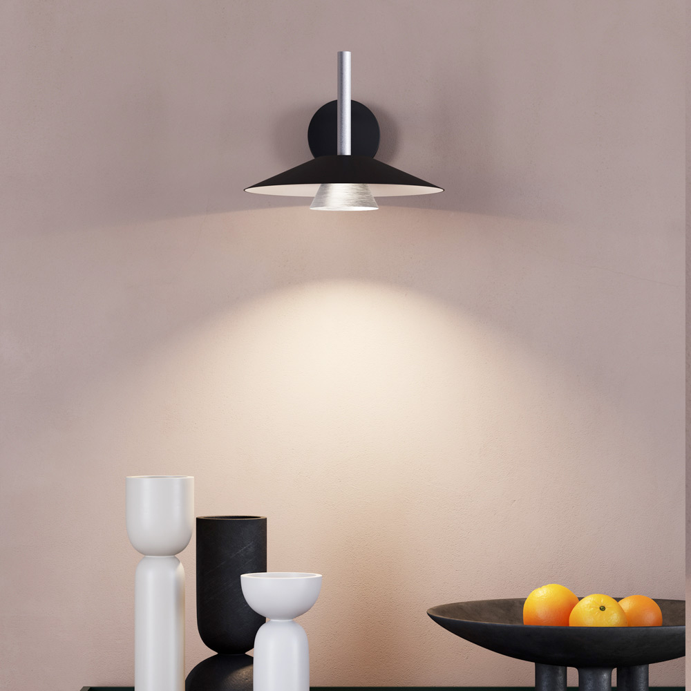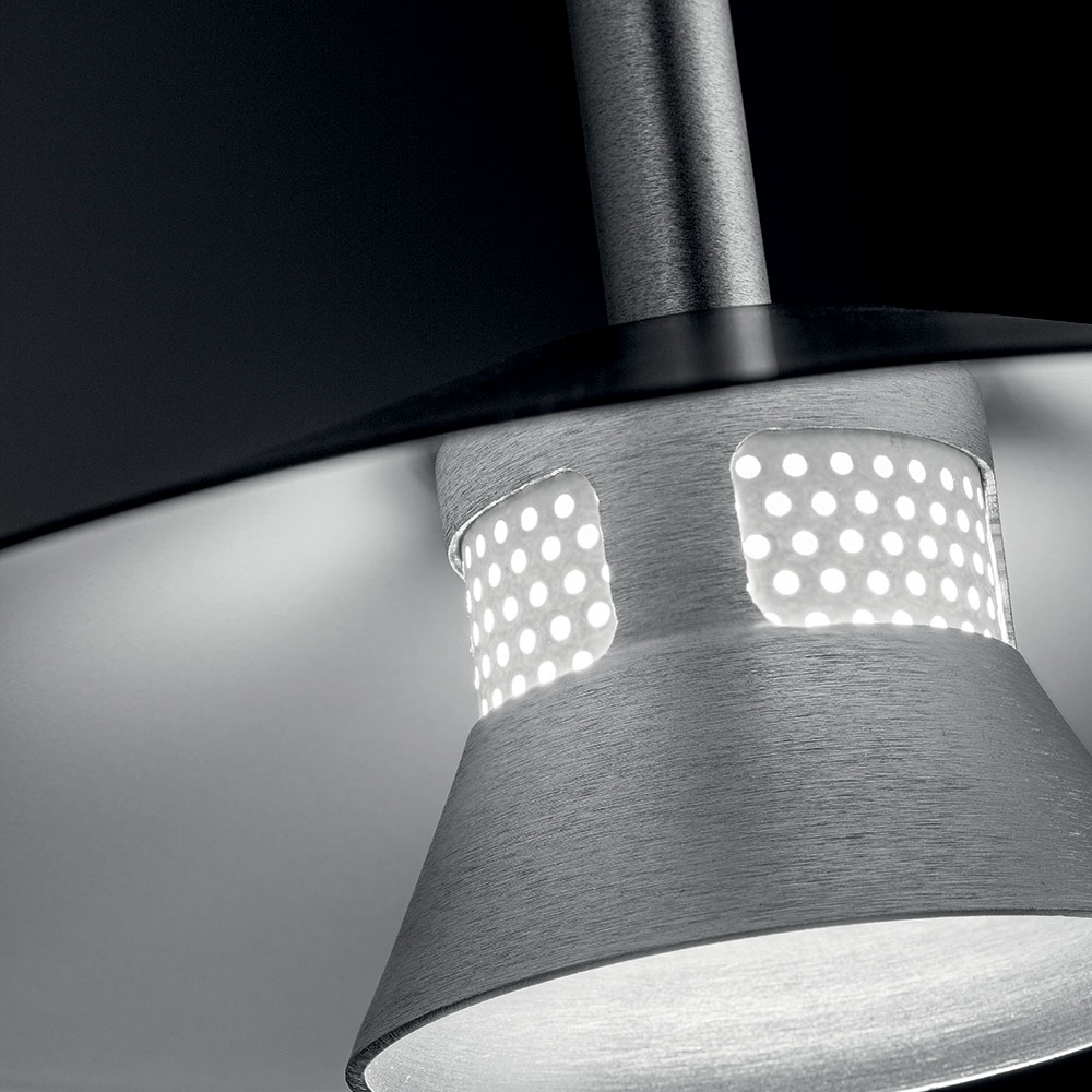 Esta lámpara es una fusión perfecta de diseño contemporáneo y elegancia industrial , diseñada para quienes aprecian los detalles refinados y una estética audaz. Su estructura geométrica, con un difusor cónico y un gran disco reflectante, crea un fascinante juego de volúmenes y contrastes , garantizando una luz direccional y envolvente .