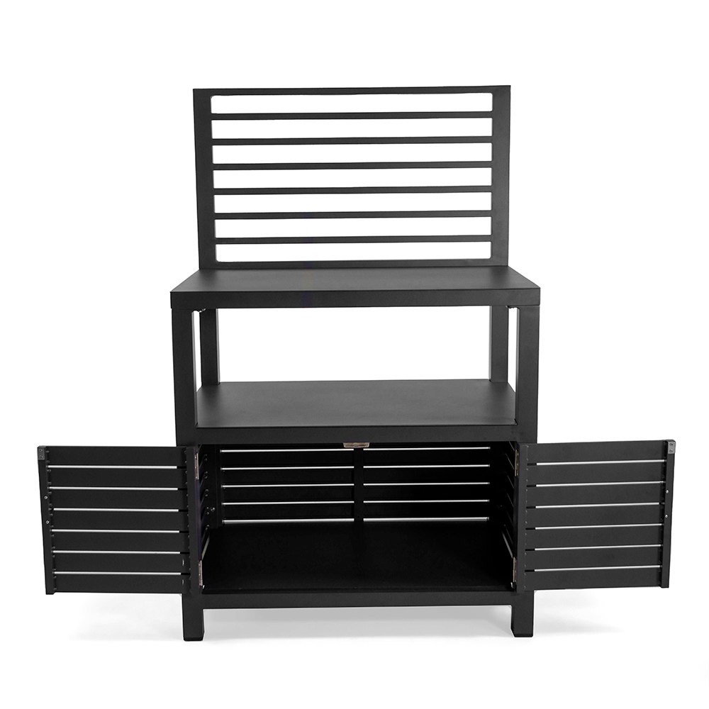 Su robusto armazón de aluminio garantiza resistencia a la intemperie y durabilidad, mientras que el diseño de lamas añade un toque de sofisticación. Este aparador no sólo es un complemento práctico, sino también una pieza decorativa que realzará la elegancia de su espacio de vida al aire libre.