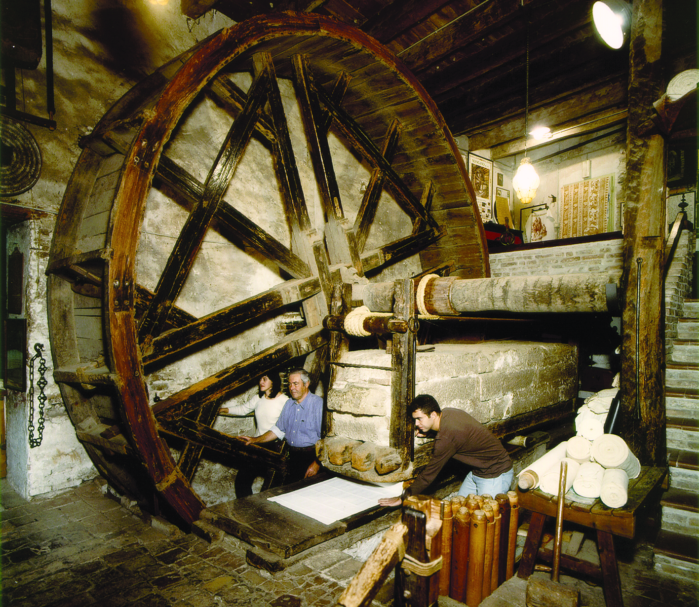 Su funcionamiento se debe al equilibrio entre la rueda y la roca de lado. La rueda actúa como una palanca y mueve la roca, que tiene la importante tarea de planchar y compactar el lienzo. Ambos pesan 55 quintales y, gracias a esta relación perfecta, el mangle se mueve cuando el hombre entra en la rueda con su propio peso y rompe la balanza. El lienzo está envuelto alrededor de rodillos de madera llamados vigas. Los rodillos se colocan debajo de la roca y siguen el movimiento de la piedra, de un lado a otro, lo que permite planchar. Es el único peso del hombre hacer que la rueda se mueva, lo que facilita esta operación llamada llenado. Incluso hoy, antes de imprimir el lienzo y después de imprimirlo, procedemos con este giro de la rueda para embellecer las telas y obtener un excelente resultado.