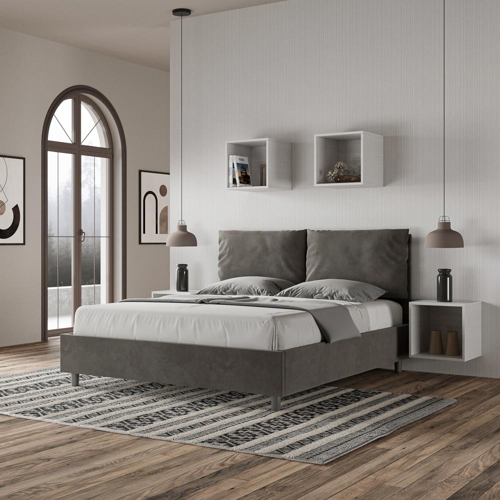 Cama de matrimonio acolchada de 160x200 cm realizada con paneles de aglomerado y revestida de microfibra , íntegramente Made in Italy. Esta cama doble con estructura tapizada encarna a la perfección las ventajas de una cama tapizada: comodidad, estilo contemporáneo, funcionalidad y un uso eficiente del espacio . Con su cabecero ancho y acolchado , ofrece un rincón de relax ideal para leer o ver la televisión, realzando tu dormitorio. Elegante y con estilo, esta cama está tapizada en microfibra, lo que facilita y agiliza su limpieza: simplemente límpiala con un paño de microfibra para mantenerla reluciente.