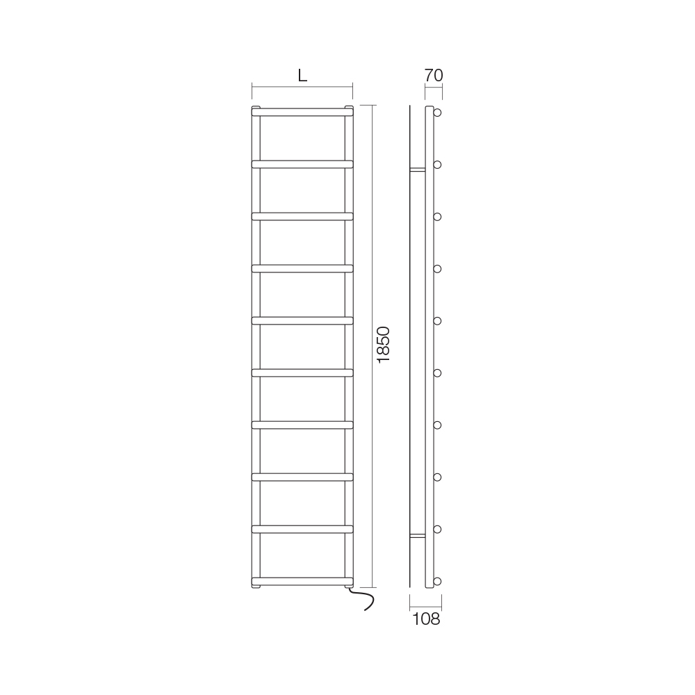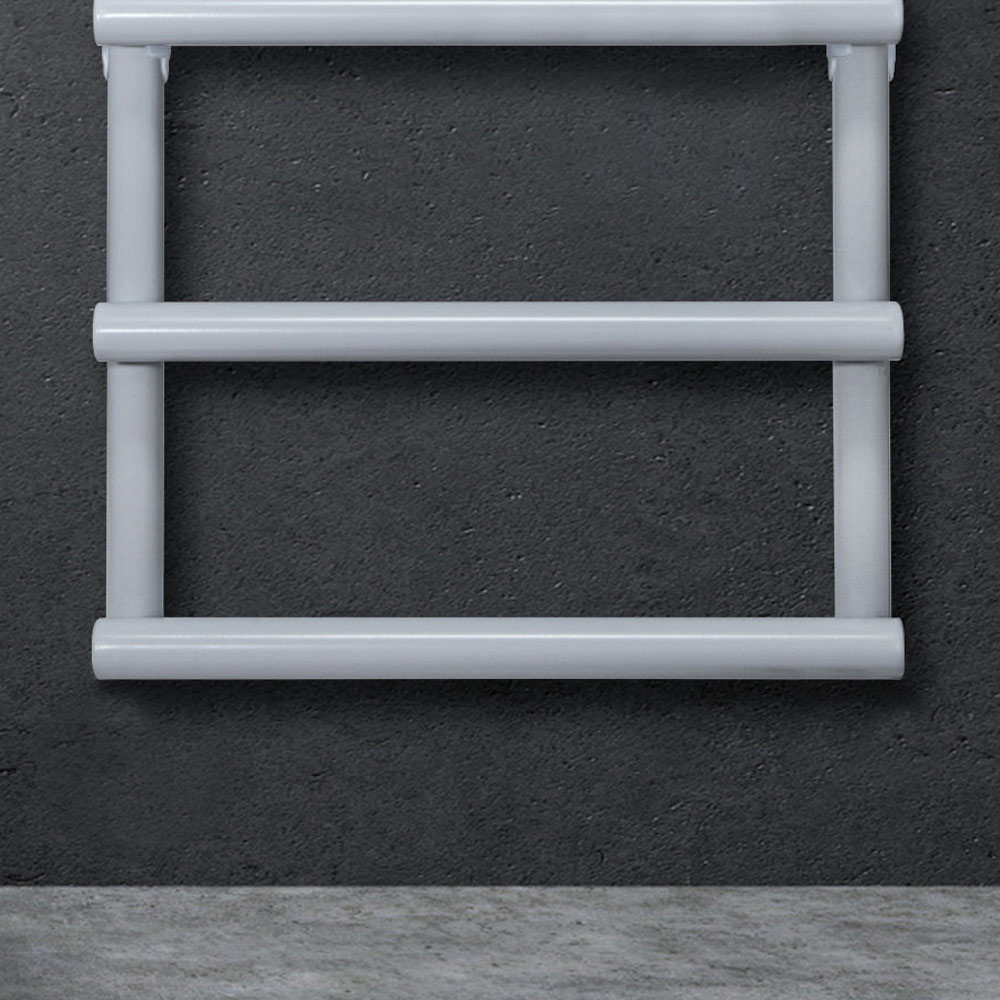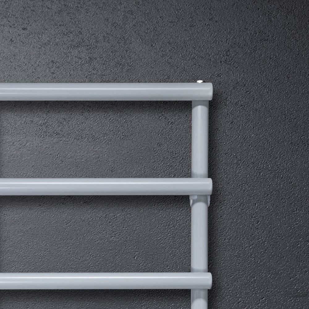 Secatoallas eléctrico en acero al carbono acabado gris claro con elementos horizontales y colectores verticales íntegramente fabricados en Italia con kit de fijación a pared incluido . Kit de electrificación situado en la parte inferior derecha.