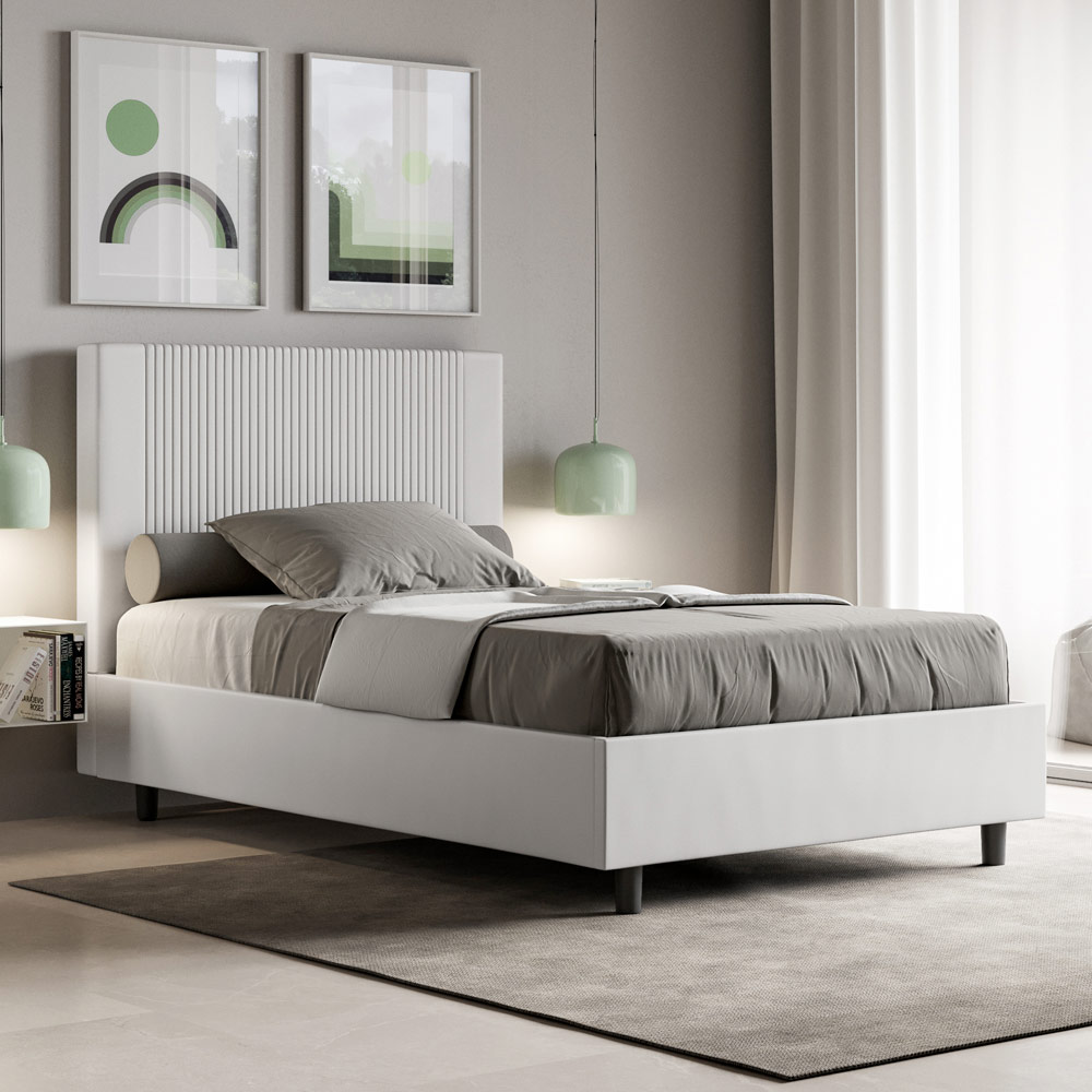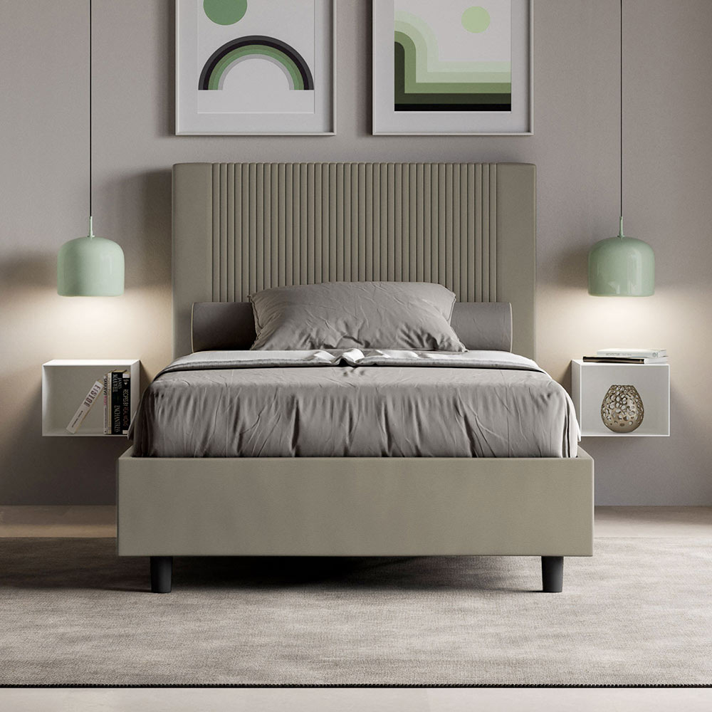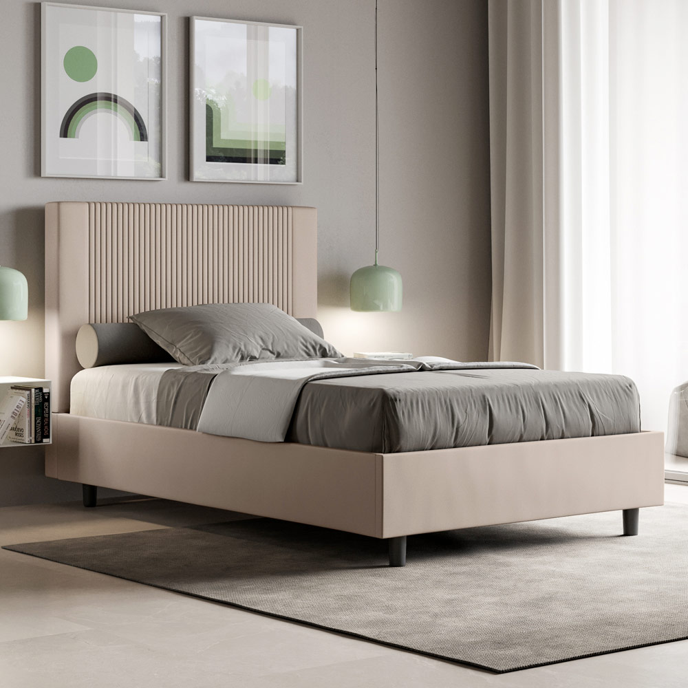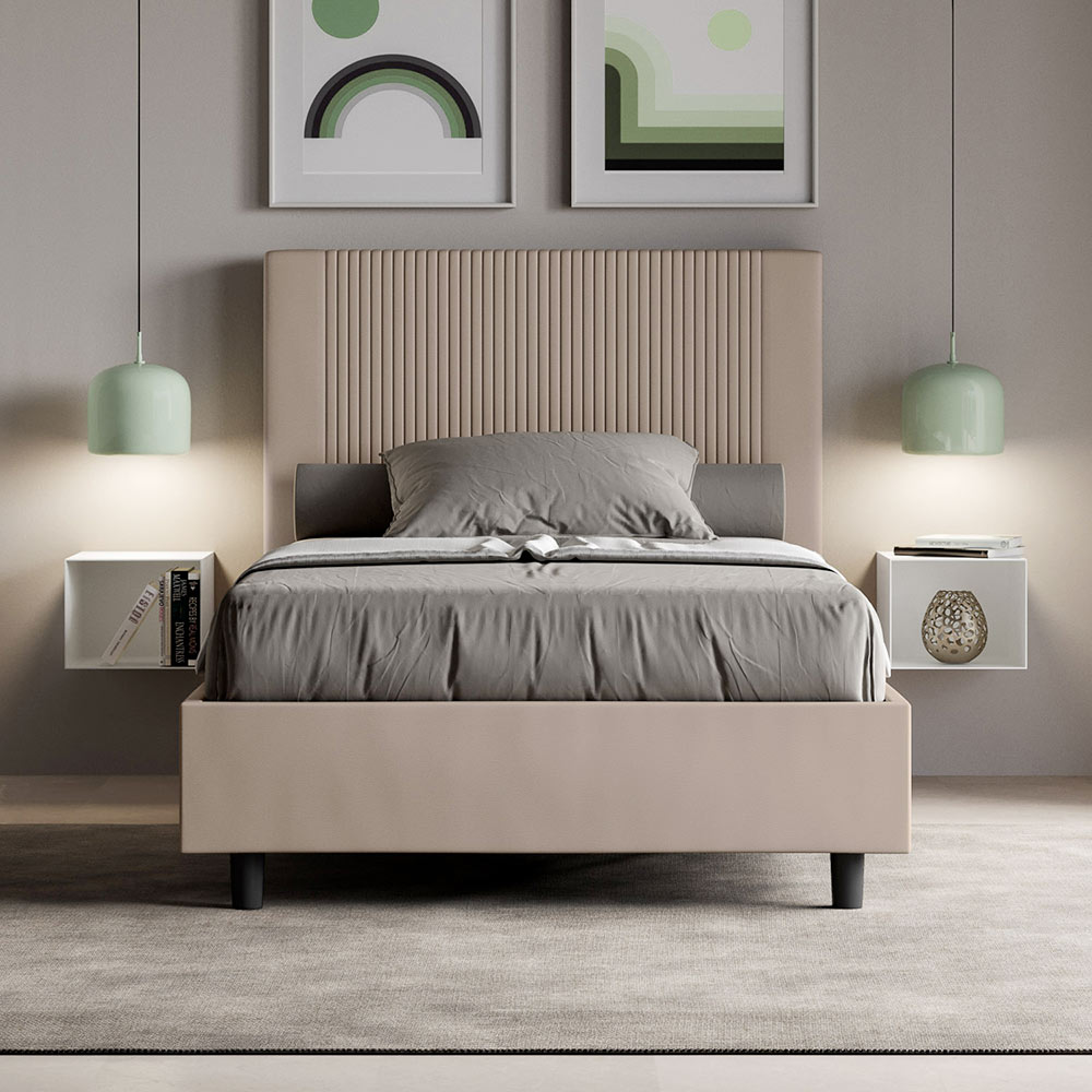 Cama francesa 140x200 cm acolchada realizada con paneles de melamina y revestida en símil piel , totalmente Made in Italy. Esta cama francesa, con su estructura acolchada, es un producto de fabricación italiana fabricado en piel sintética. Su diseño sencillo pero moderno es perfecto para espacios de sofisticación. La característica principal de este modelo es su cabecero, adornado con un motivo de líneas verticales , ideal para quienes desean combinarlo con espacios visualmente impactantes con paredes prominentes, manteniendo una elegancia inconfundible.