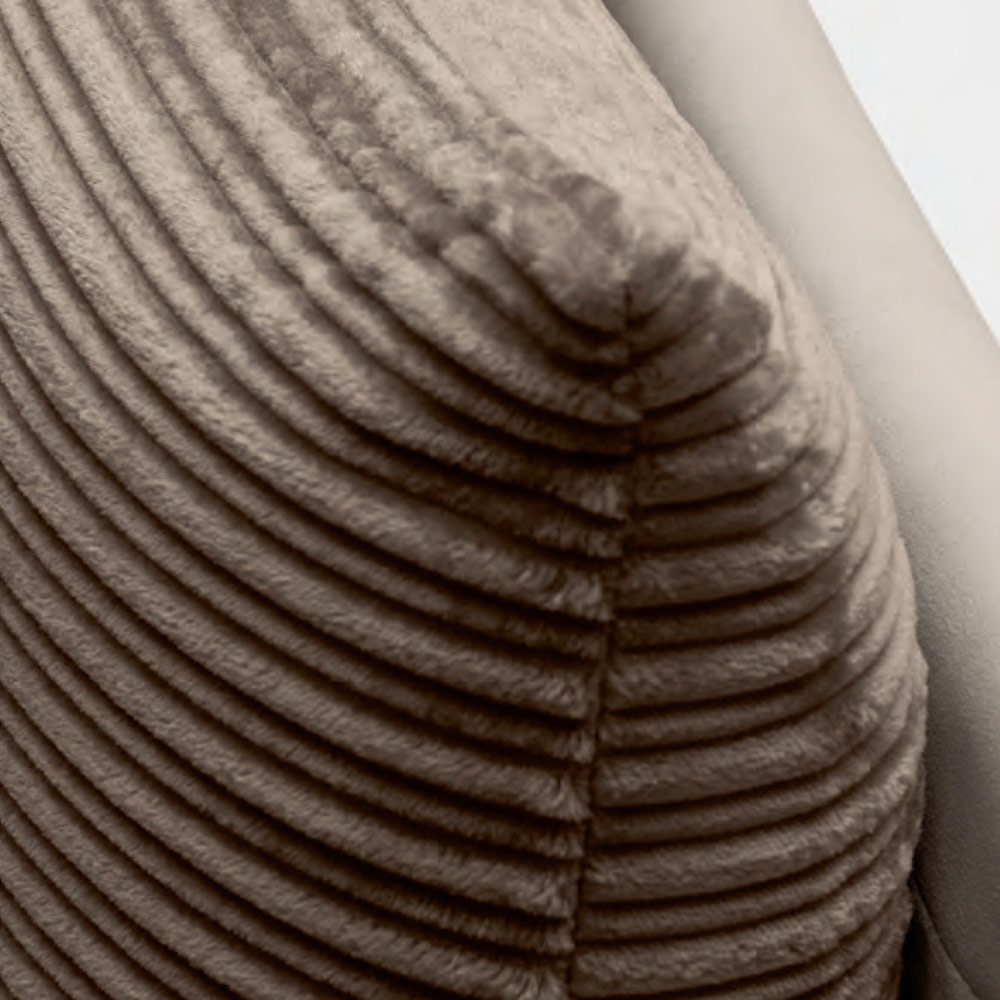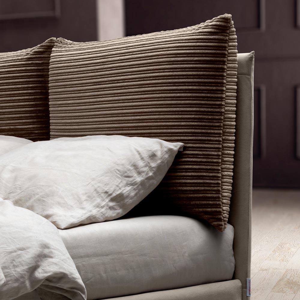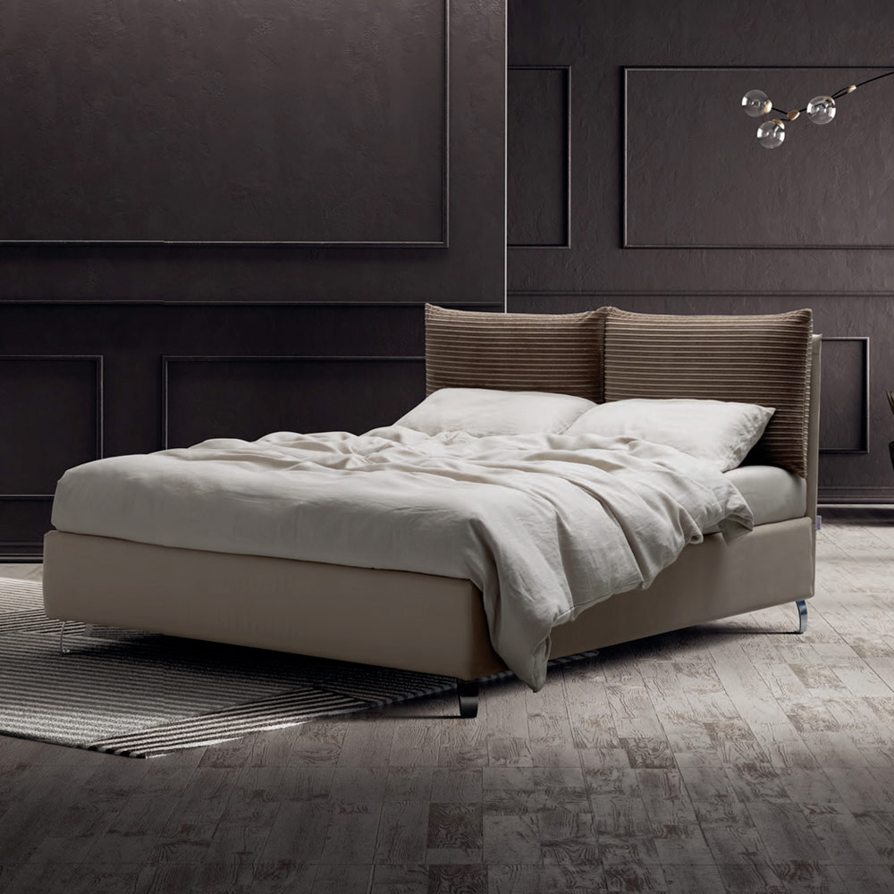 cajón contenedor, pies de metal con acabado en acero pulido (altura 12 cm) y cabecero realizado con dos suaves cojines en tejido ecológico y ecológico, en contraste con la cama en tejido repelente al agua. Los cojines se fijan a la estructura con prácticos insertos adhesivos de velcro que permiten una extracción cómoda y sencilla.