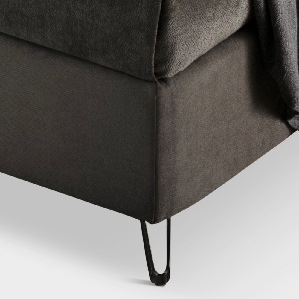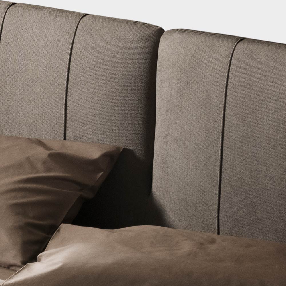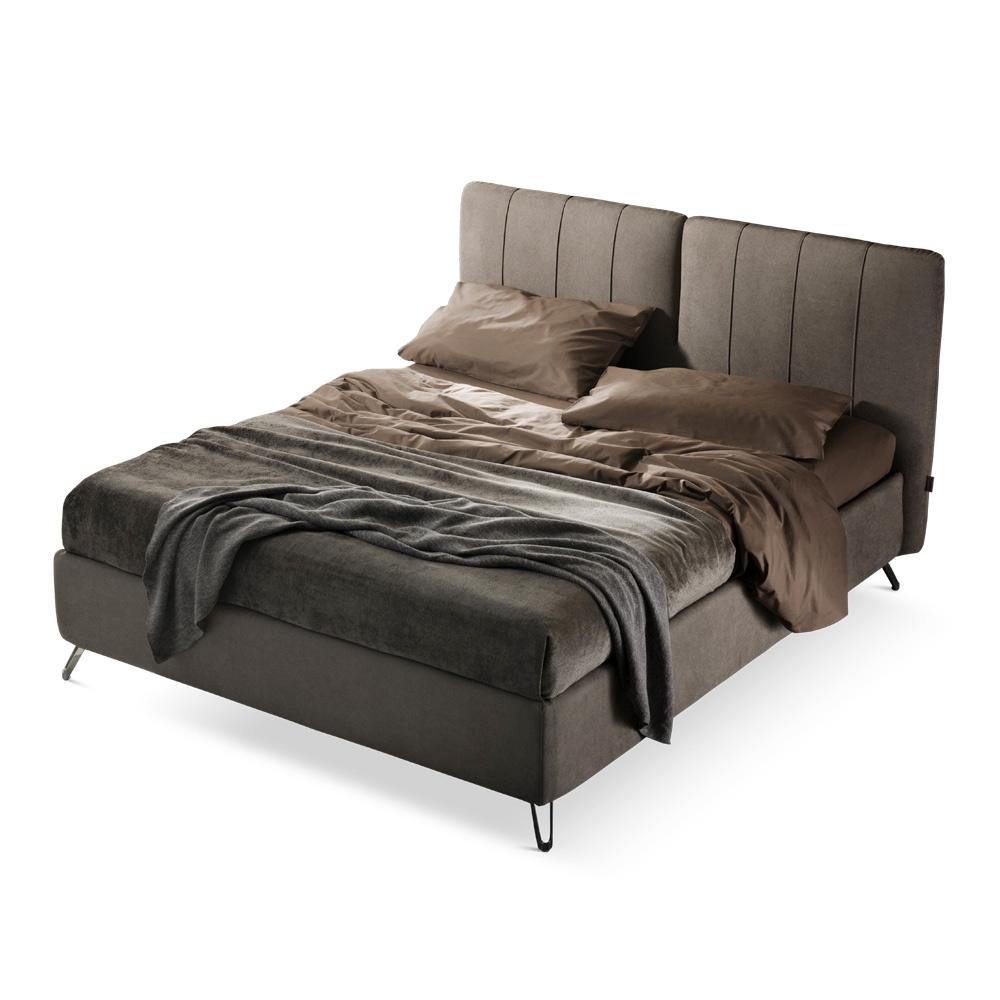arcón contenedor, pies de metal con acabado acero pulido (altura 12,3 cm) y cabecero obtenido gracias a un acolchado especial, realizado con perfiles verticales cordonados, que le confieren un original efecto estético en tejido hidrófugo y antimanchas.