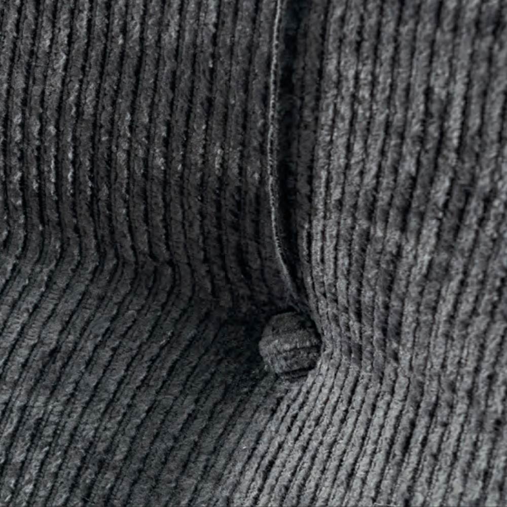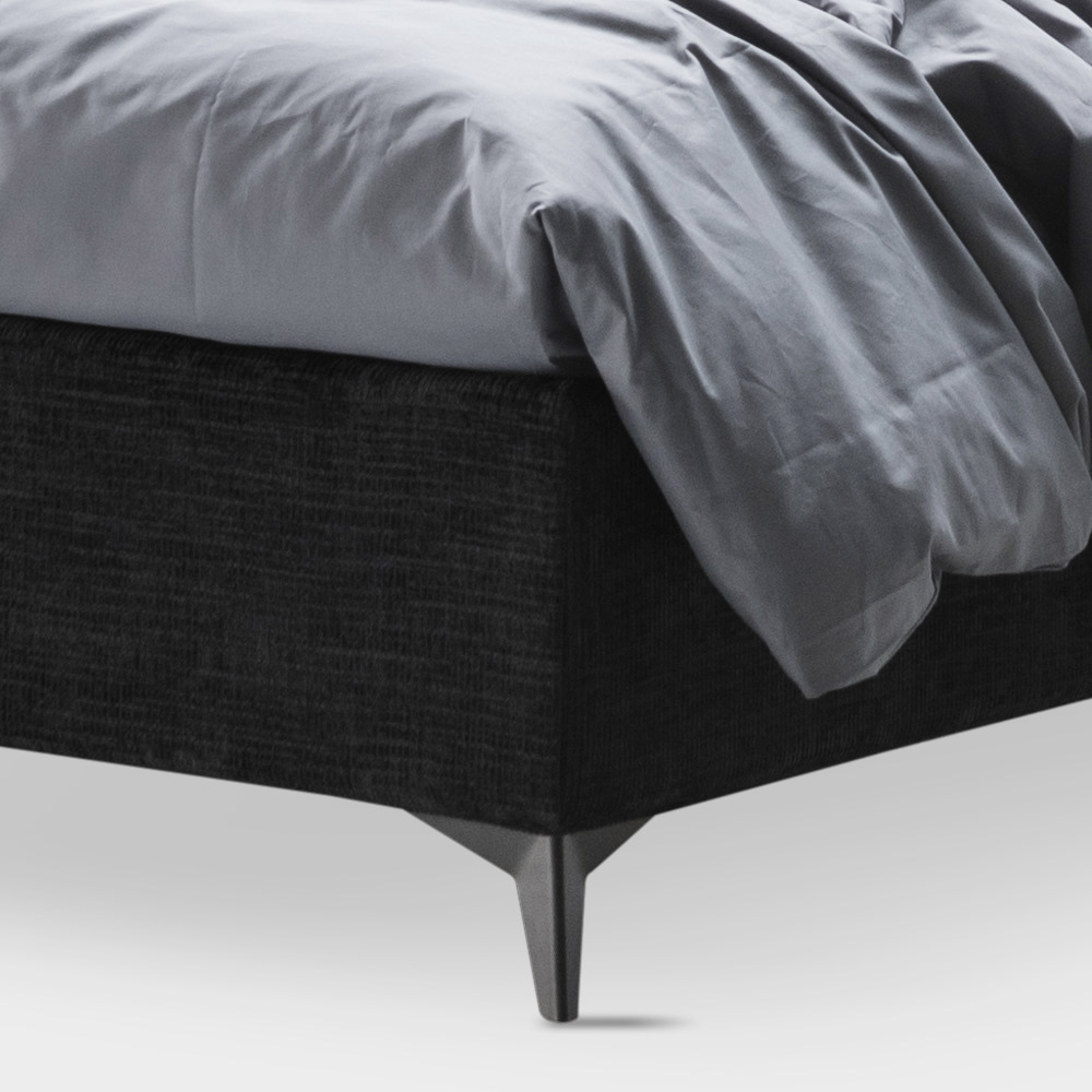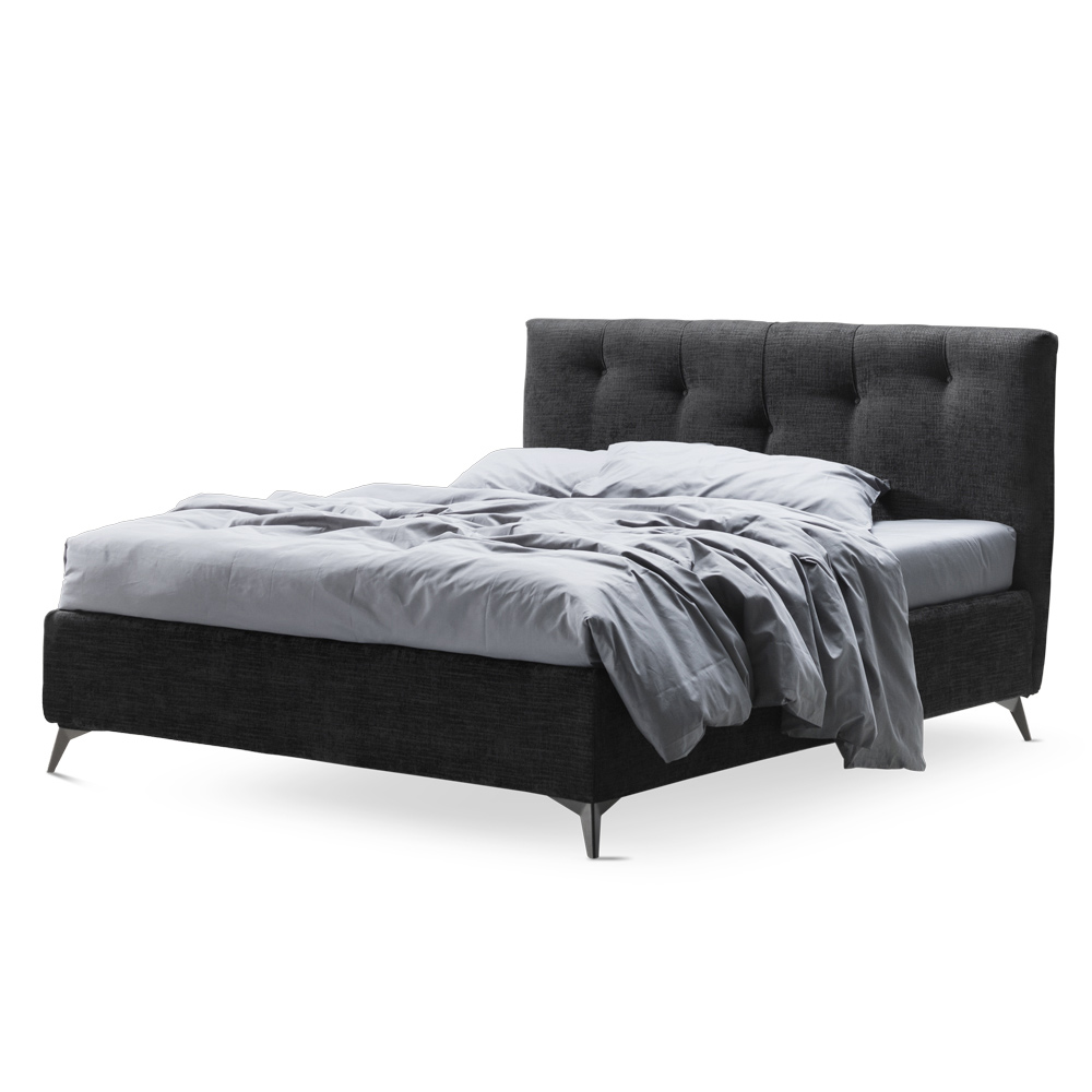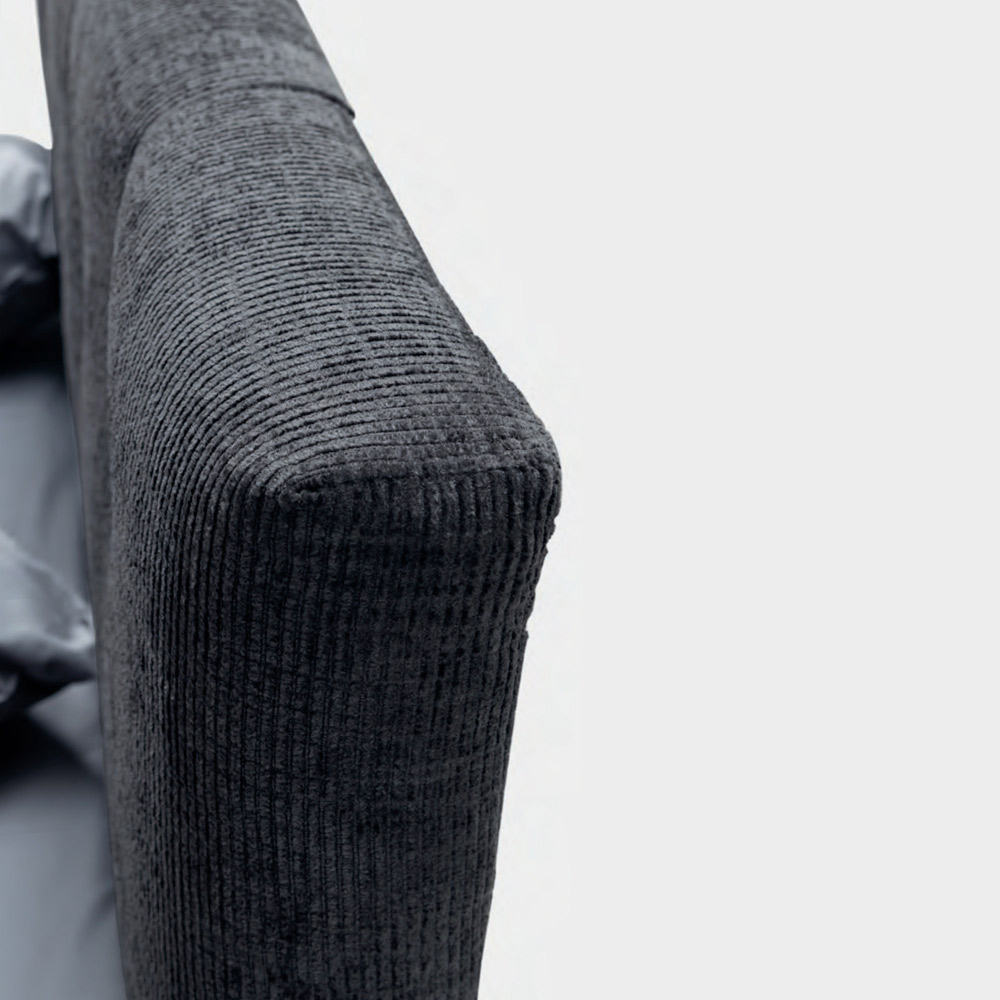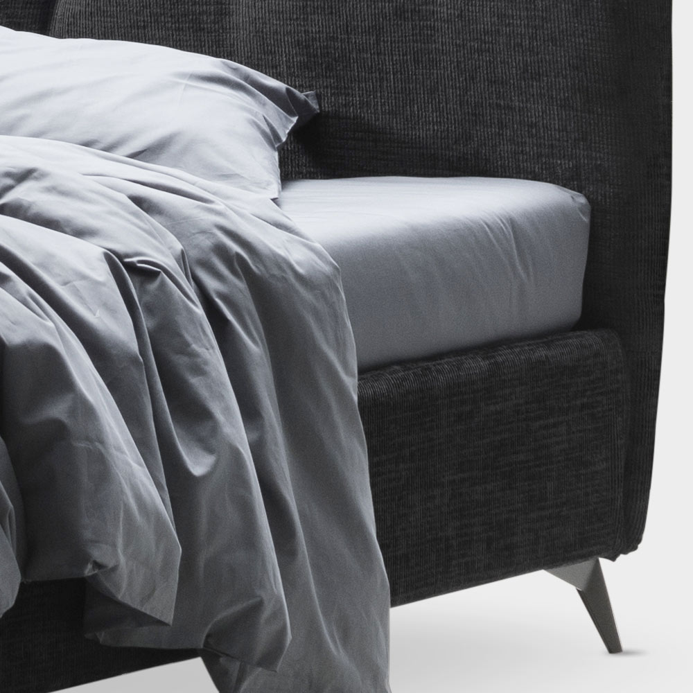 de metal acabado antracita (altura 13,5 cm) y cabecero caracterizado por cordones verticales en relieve embellecidos con acolchado abotonado.