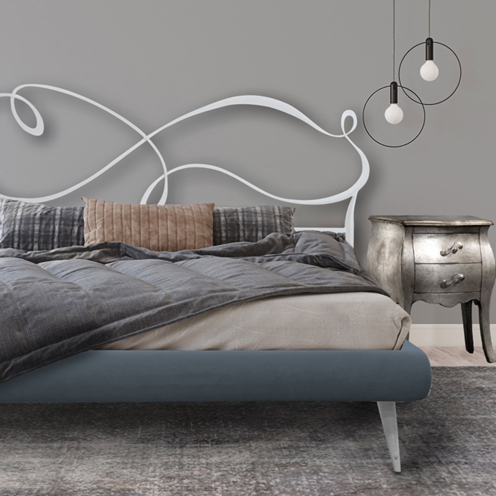 Esta cama nació del deseo de crear una atmósfera luminosa y suspendida en el dormitorio. Las líneas crean un soplo de viento que aligera la estructura y la hace perfecta para completar el mobiliario de cualquier zona de noche sin renunciar a la funcionalidad y el confort.