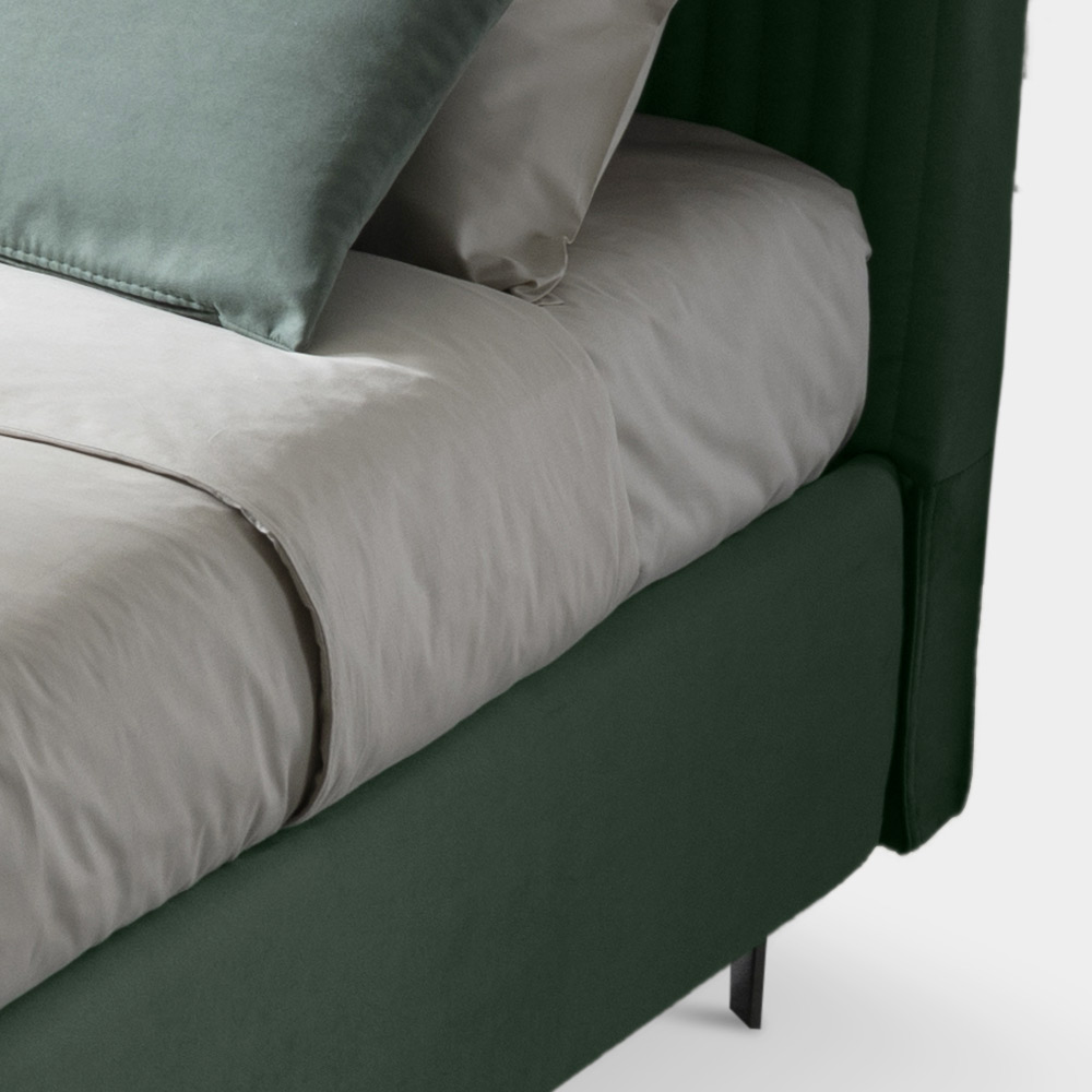 - Los paneles inferiores del arcón contenedor, certificados en clase E1 con bajísimo contenido de formaldehído, están realizados en laminado de 10,5 mm de espesor, de color gris a juego con el tejido interno del marco de la cama, para permitir una fácil limpieza e higiene mediante un paño húmedo común para el polvo.