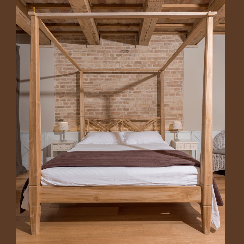 Esta cama con dosel de teca maciza es un mueble encantador, capaz de transformar el dormitorio en un espacio refinado y evocador. Su sólida estructura y su elaboración artesanal realzan la veta natural de la madera , creando un ambiente cálido y elegante con un toque atemporal.