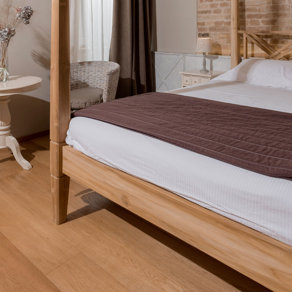 Las líneas esenciales del dosel hacen que esta cama sea perfecta tanto para ambientes clásicos como más contemporáneos, ofreciendo una presencia dramática sin sacrificar el equilibrio estético.
