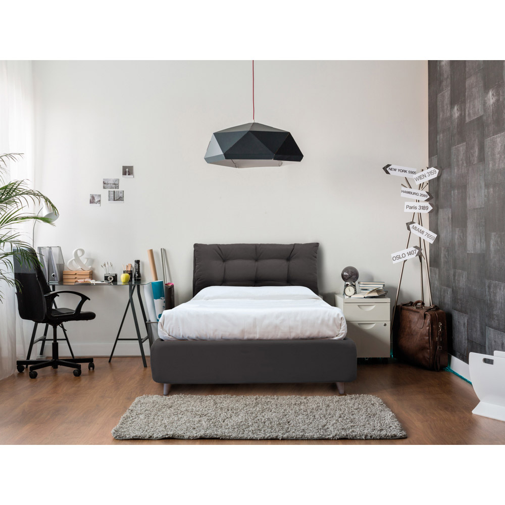 Cama doble pequeña realizada con estructura de panel de fibra de madera (MDF) de media densidad, revestida en tela y pies de polipropileno color gris tórtola.