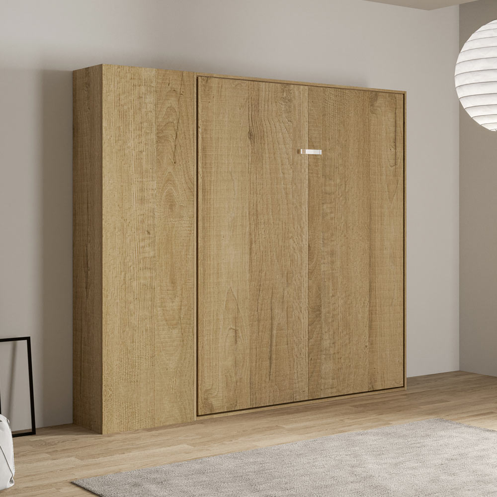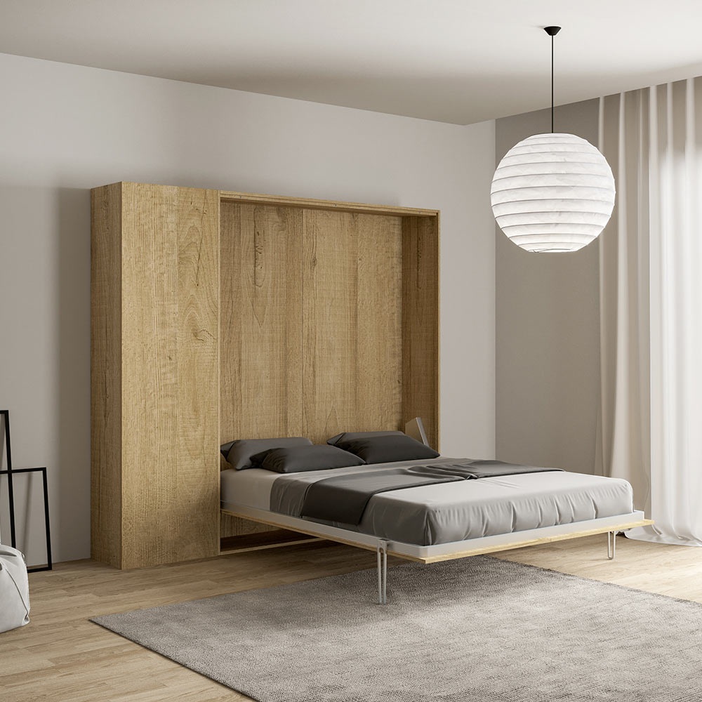 La estructura de la cama está fabricada con tableros de partículas de melamina de 18 mm de espesor , lo que garantiza resistencia y durabilidad. El mecanismo de apertura es suave y seguro, transformando la pared en una cómoda cama con un simple gesto.