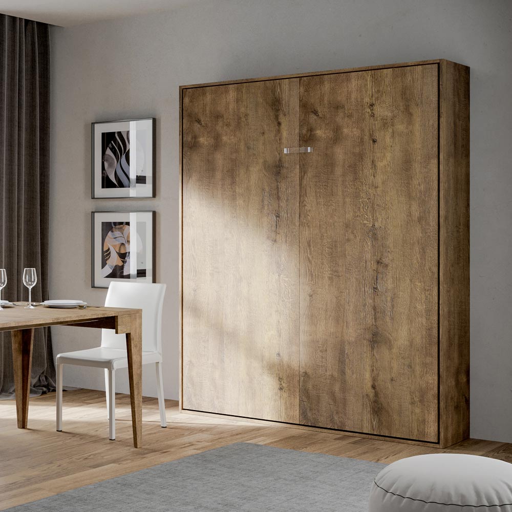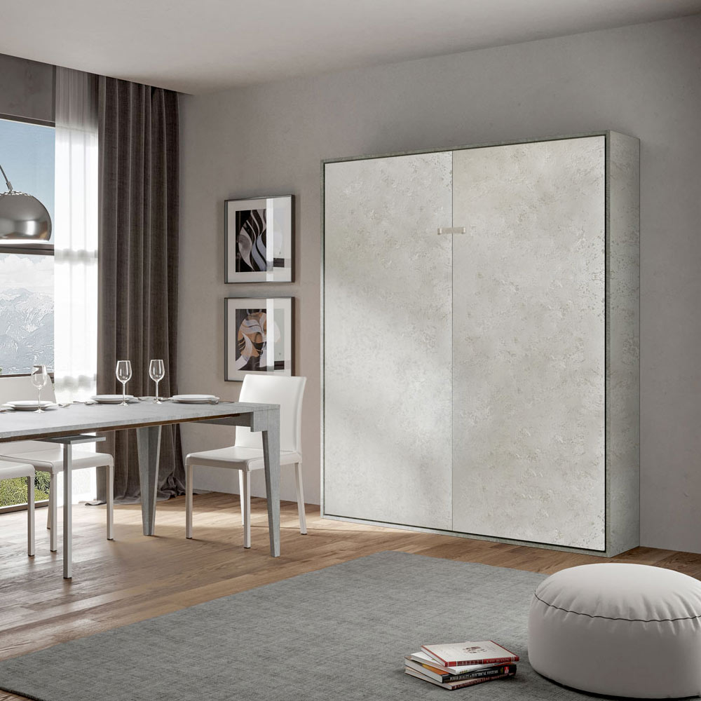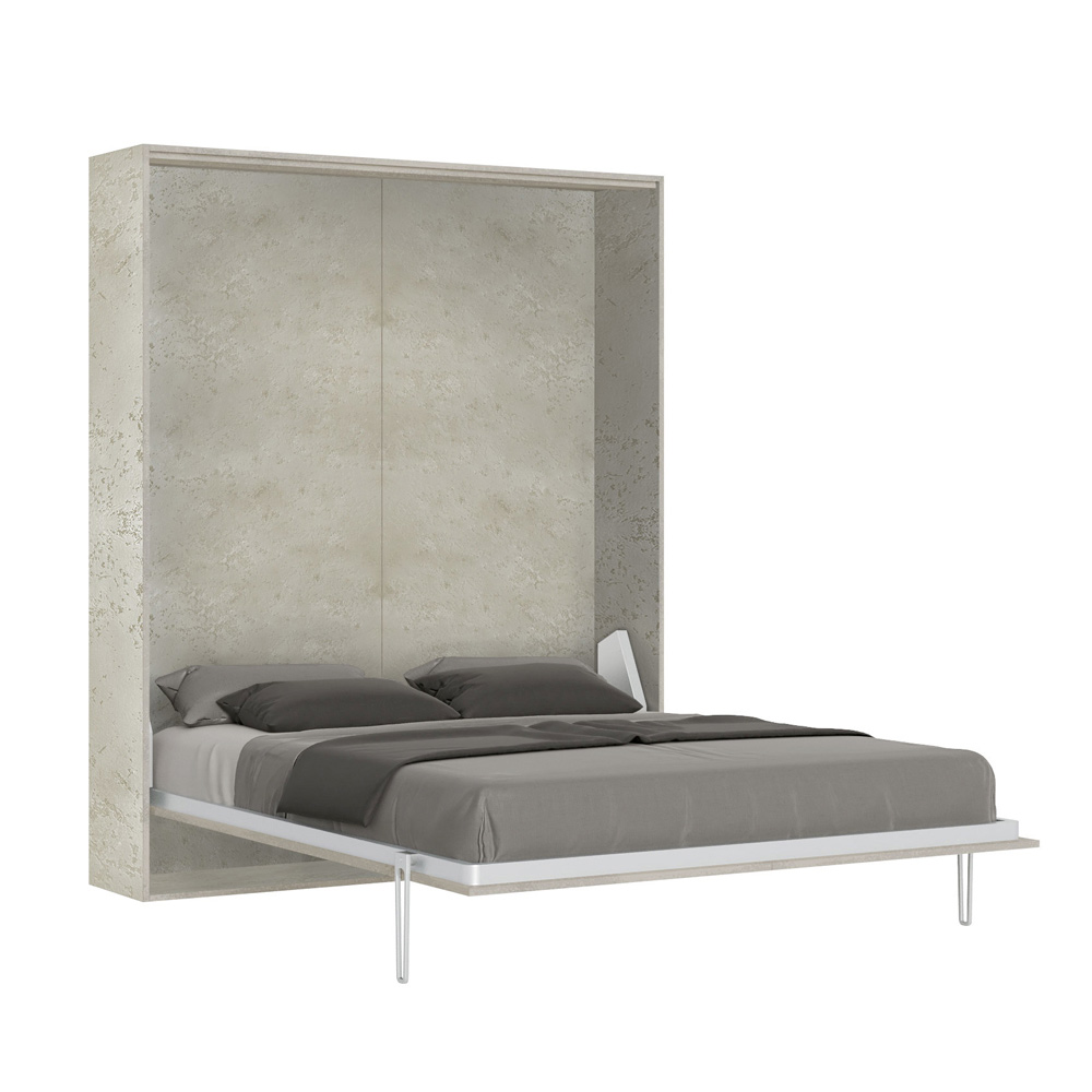 La estructura de la cama está fabricada con tableros de partículas de melamina de 18 mm de espesor , lo que garantiza resistencia y durabilidad. El mecanismo de apertura es suave y seguro, transformando la pared en una cómoda cama con un simple gesto.