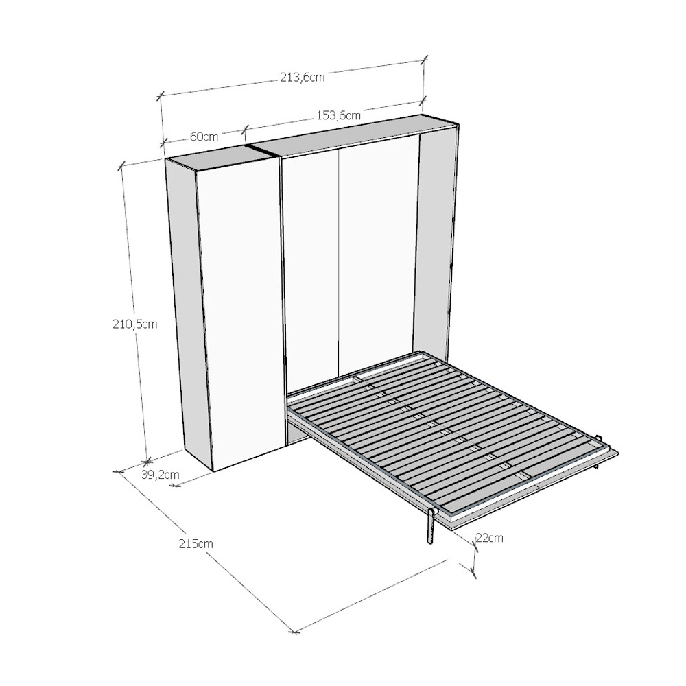 La estructura de la cama está fabricada con tableros de partículas de melamina de 18 mm de espesor , lo que garantiza resistencia y durabilidad. El mecanismo de apertura es suave y seguro, transformando la pared en una cómoda cama con un simple gesto.