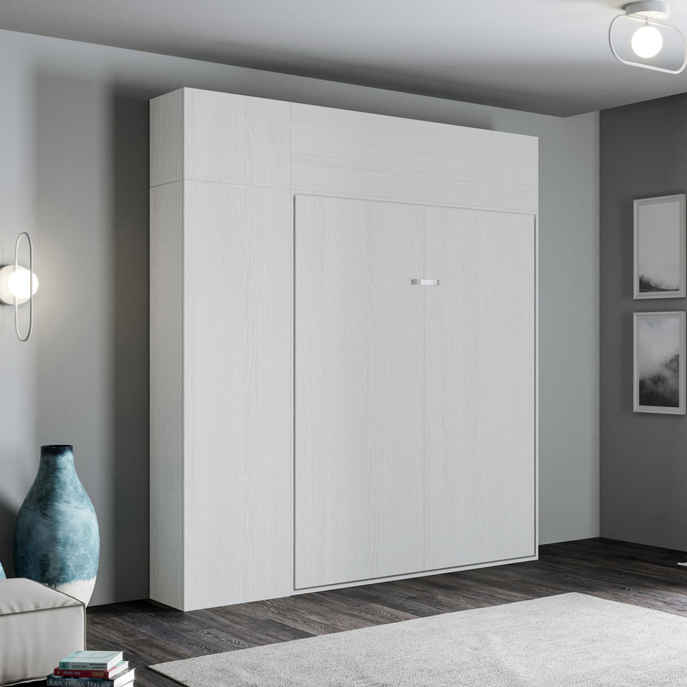 Cama abatible realizada con estructura en paneles de partículas de madera ennoblecidas de 18 mm de espesor, estructura somier en hierro reforzado pintado con polvos epoxídicos en color aluminio gofrado, incorpora somier de láminas de haya de 143x190 cm con cinchas para colchón.