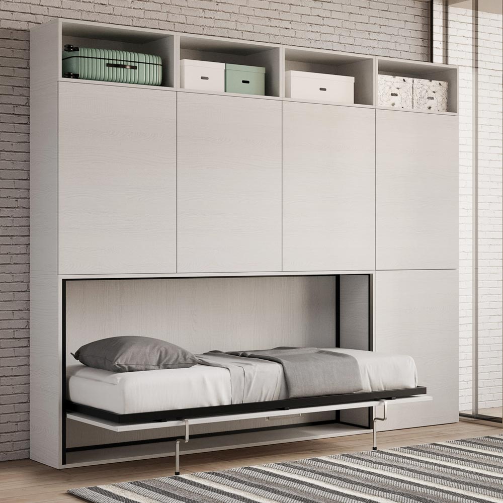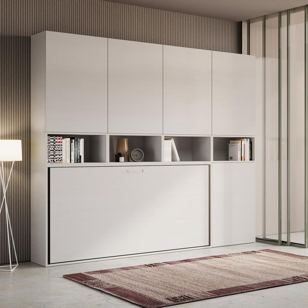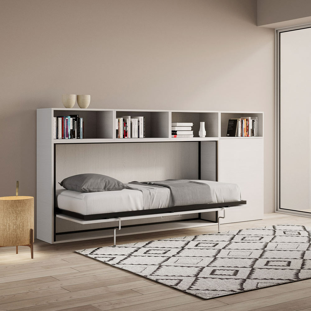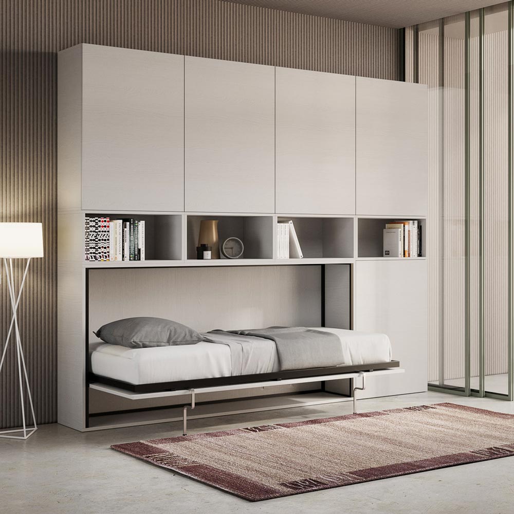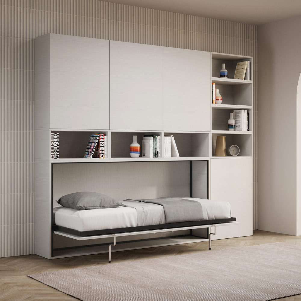 Cama individual abatible que se integra con una composición de muebles Made in Italy
