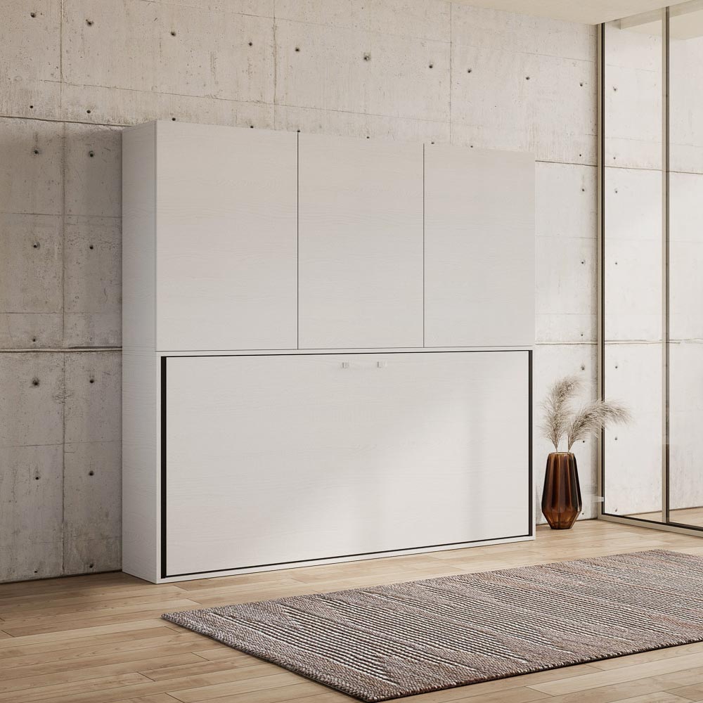 Cama abatible horizontal realizada con estructura formada por paneles de partículas de madera ennoblecidas de 18 mm de espesor, estructura del somier en hierro reforzado pintado con polvos epoxídicos en color aluminio gofrado.