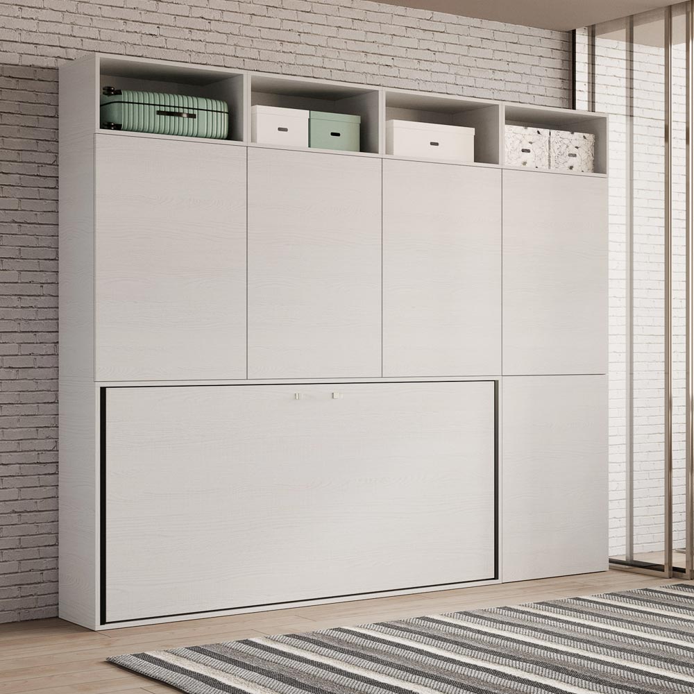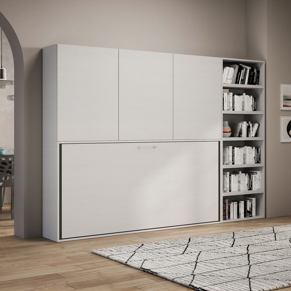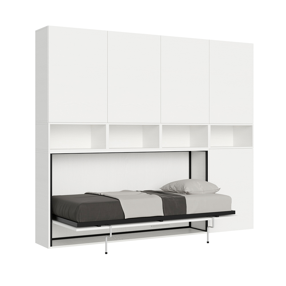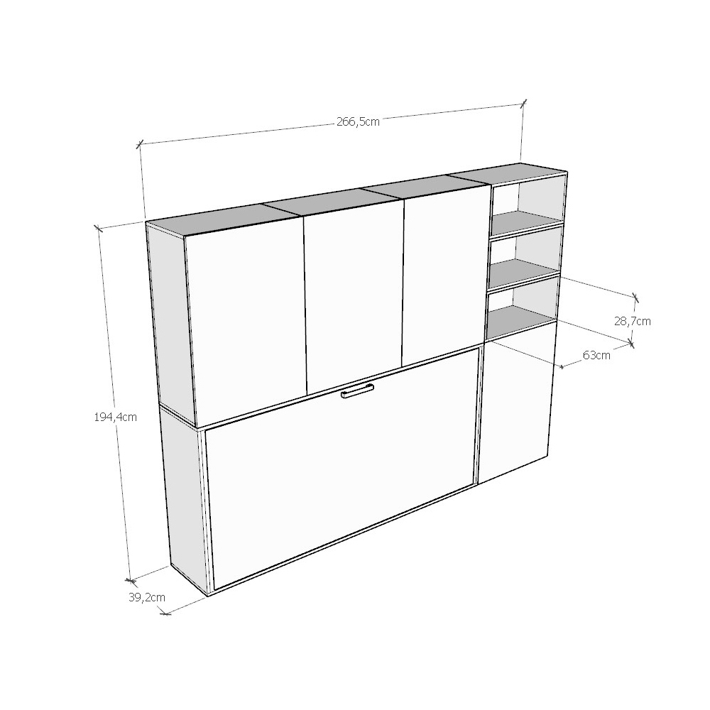 - COMPOSICIÓN E : Cama individual abatible en librería-armario con once compartimentos (cuatro con puerta y estante interior y siete compartimentos abiertos) - Cama cerrada contra la pared: 266,5 x 39,2 x altura 226,7 cm / Cama abierta: 266,5,9 x 106 x altura 226,7 cm