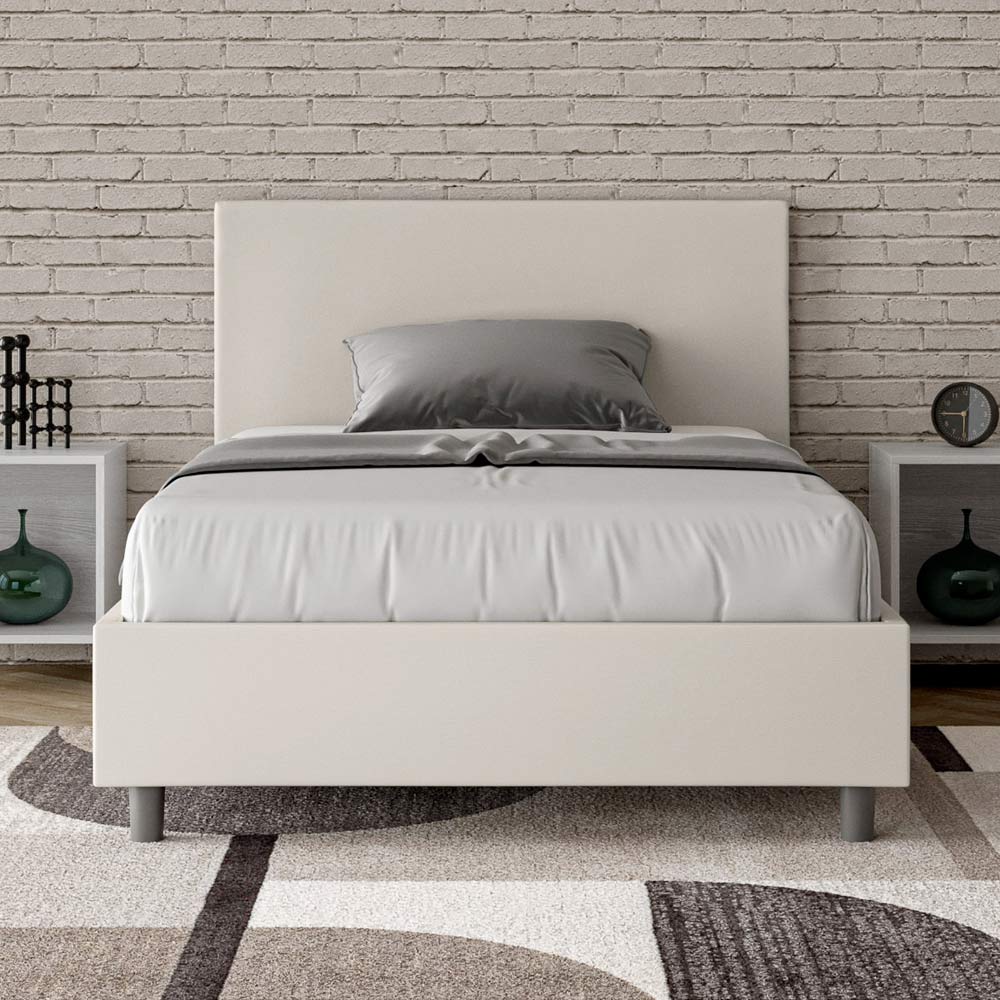 Cama matrimonial acolchada de 120x200 cm, fabricada con paneles de aglomerado y revestida en piel sintética , totalmente Made in Italy. Esta cama tamaño queen cuenta con un armazón acolchado y es un ícono de estilo discreto pero elegante. Con un cabecero de piel sintética , esta cama se integra a la perfección en cualquier espacio, añadiendo un toque distintivo de clase y lujo, típicamente italiano. Su mantenimiento es sencillo: basta con limpiarla con un paño de microfibra para conservar su belleza a lo largo del tiempo.