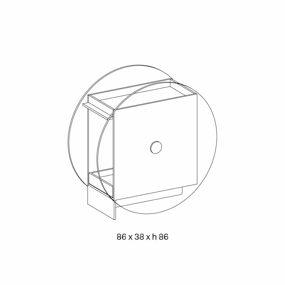 Realizado con una estructura de vidrio esmerilado extraclaro que permite vislumbrar la silueta de los objetos almacenados en él, el elemento portante real así como la pieza icónica de la pieza está compuesta por dos grandes ruedas de vidrio extraclaro . Finalmente, una bandeja extraíble de madera lacada en negro mate completa el diseño altamente estético y funcional.