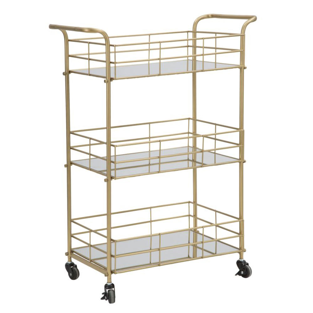 Carrito de comida de hierro dorado con baldas de espejo y ruedas.