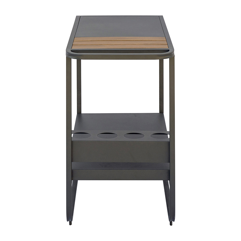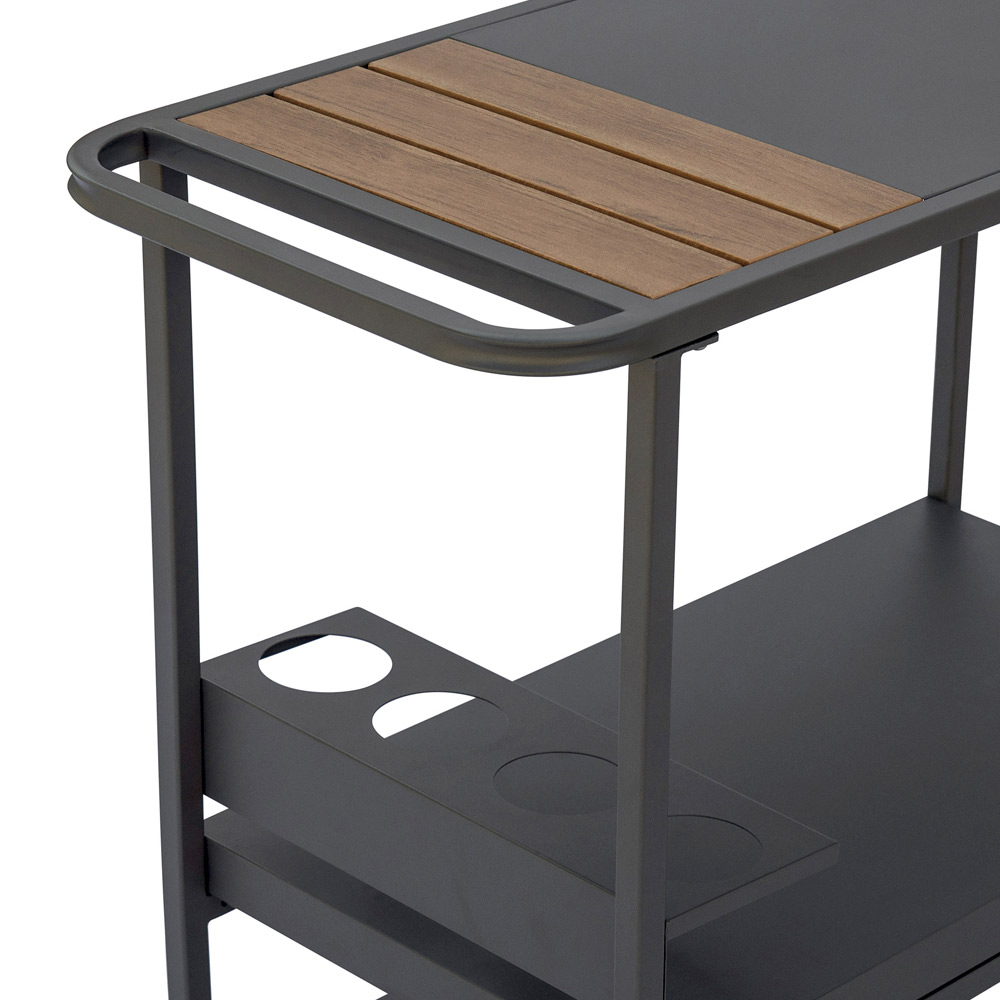 El estante superior con detalles de madera de resina aporta un toque cálido y natural al diseño moderno, creando un agradable contraste estético. El estante inferior y el portabotellas integrado ofrecen espacio adicional para organizar bebidas, vasos y accesorios, convirtiendo este carrito en el aliado perfecto para almuerzos, aperitivos o cenas al aire libre.