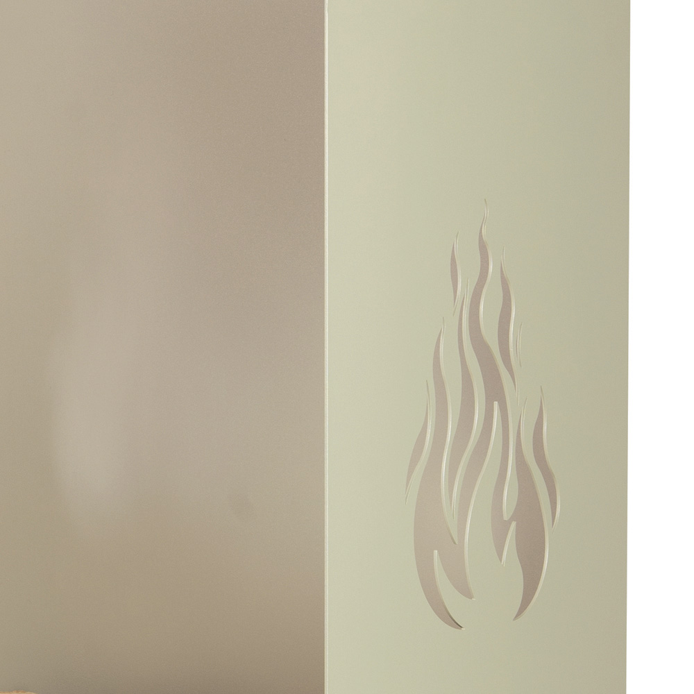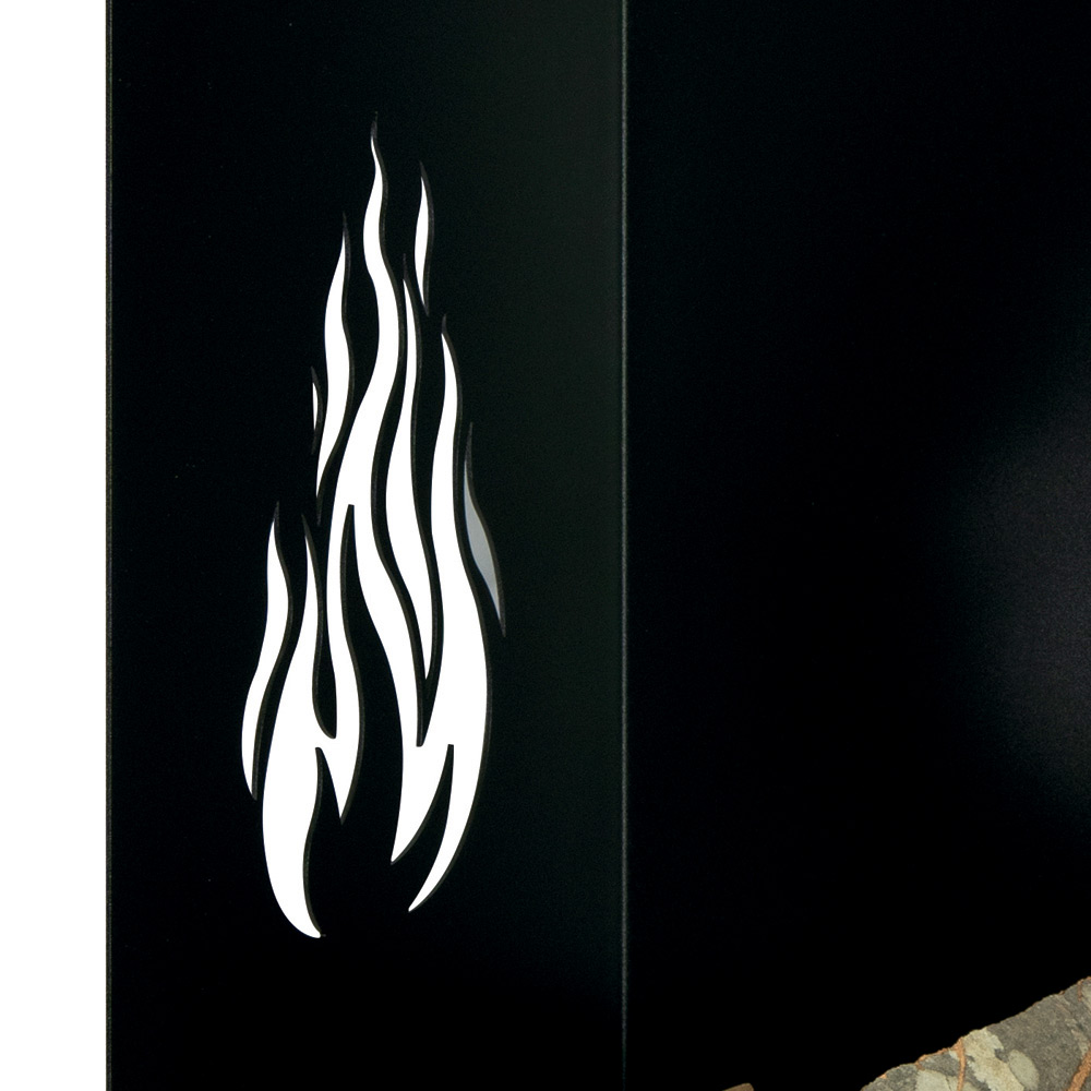 Este leñero metálico combina a la perfección estética y practicidad , siendo un objeto indispensable para los amantes de la chimenea tradicional. Su diseño moderno y robusto , con motivos de llamas en ambos lados, no solo embellece la pieza, sino que también permite ver la leña almacenada en su interior, indicando inmediatamente su función.