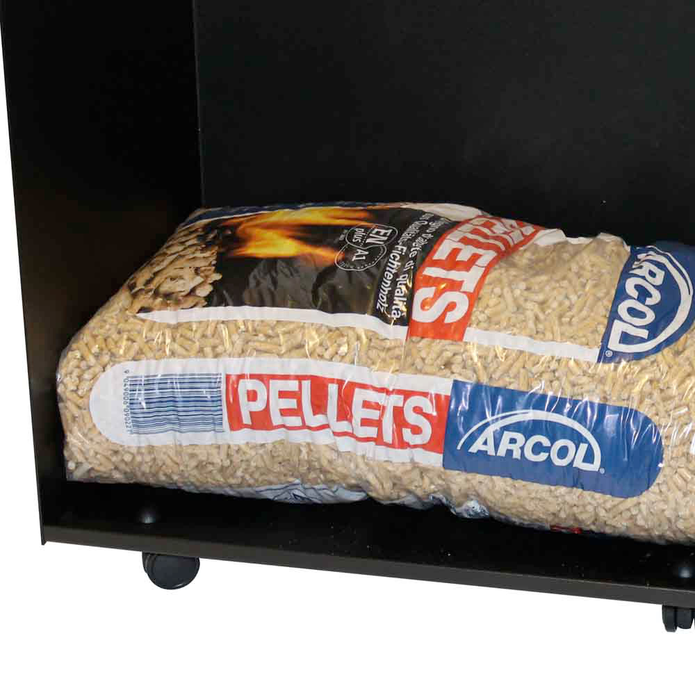 Este carrito para bolsas de pellets es un objeto práctico diseñado para facilitar la gestión y el almacenamiento de combustible para su chimenea o estufa de pellets. Su diseño robusto y acabado negro se integran discretamente en cualquier ambiente doméstico, ofreciendo una estética limpia sin sacrificar la funcionalidad.
