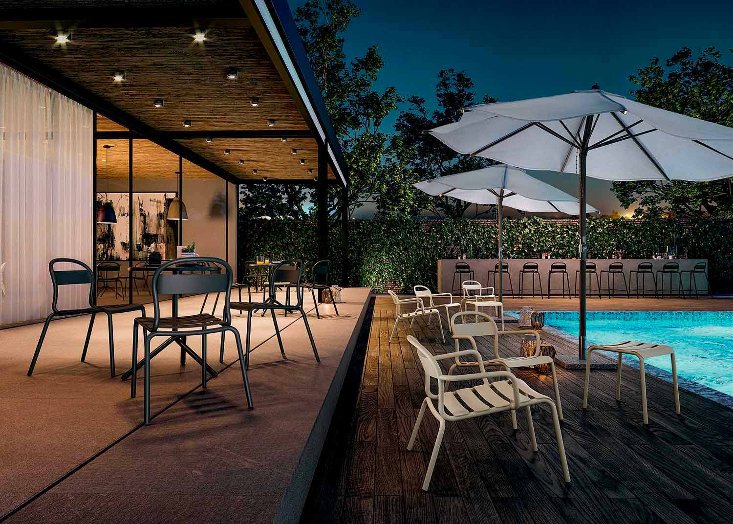 El diseño Shyla la hace fácilmente imaginable en un jardín o terraza, pero no excluye su uso incluso en situaciones interiores, en entornos domésticos y no domésticos. Hecho completamente de aluminio pintado, gracias a los 8 colores disponibles Shyla se adapta perfectamente a cualquier situación de mobiliario, desde el más moderno hasta el más tradicional, ayudando a dar color y personalidad a la habitación.