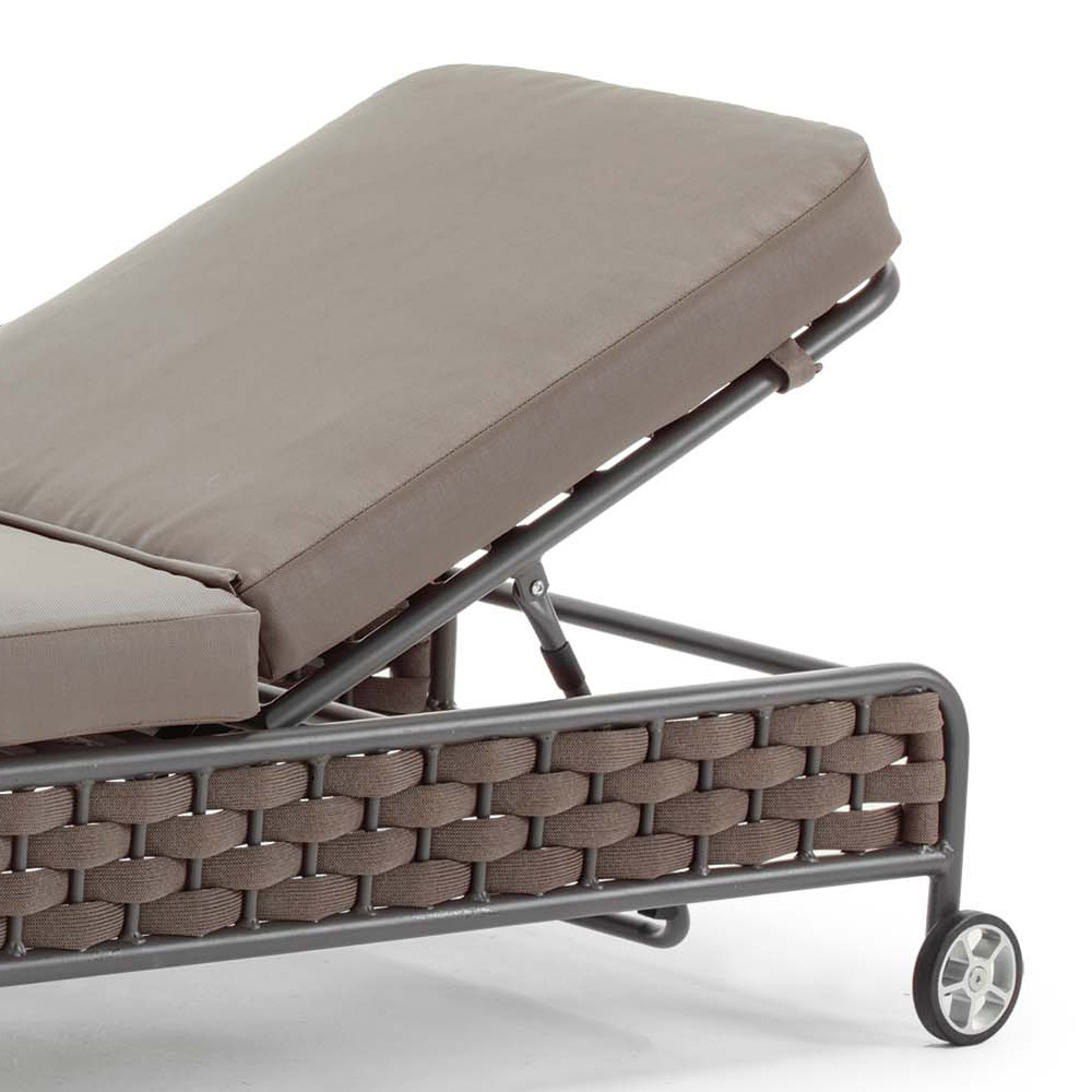 Chaise longue de jardín con estructura interna de aluminio pintado antracita envuelto en una elegante trama de cuerda de poliéster acabado marrón y cojines desenfundables en caucho hidrófugo revestido de tejido acrílico de color marrón.