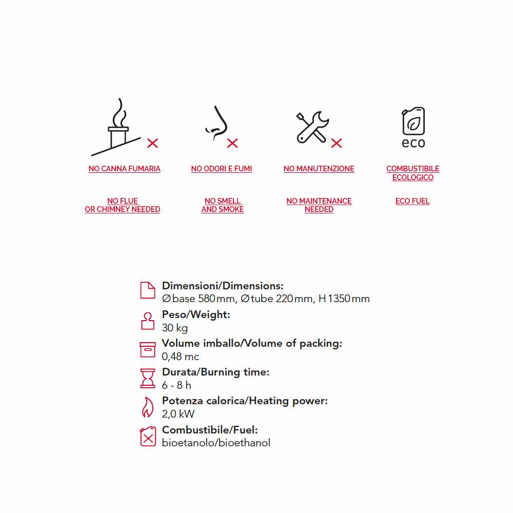 Esta chimenea está constituida por una estructura de tubo realizada en acero pintado y por un para-fuego de vidrio borosilicatado. Es una chimenea con una función principalmente decorativa y ha sido realizada a mano.