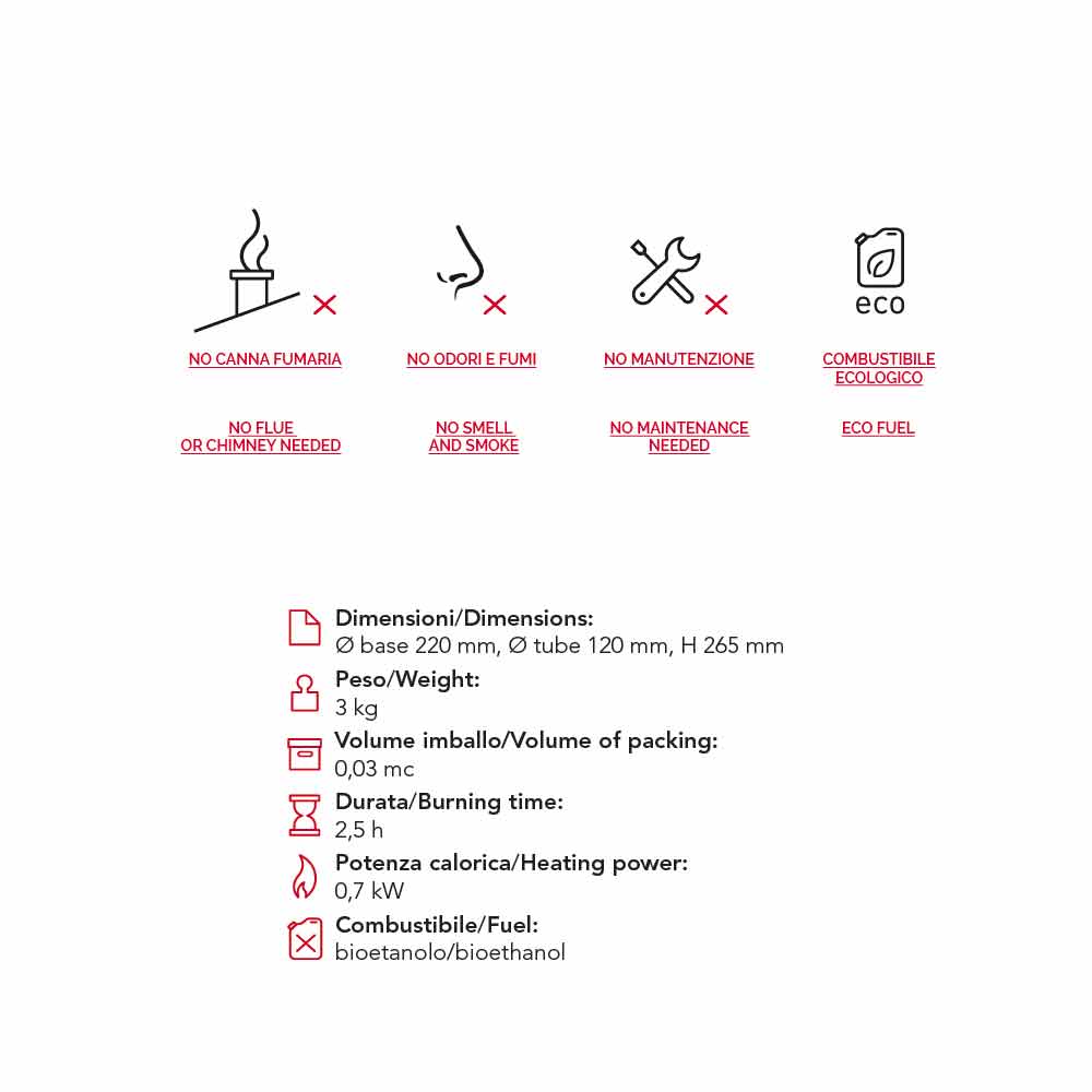 Otra de sus características es que no produce humos o vapores, además no necesita salidas de humos. Es una chimenea ecológica que no necesita de ningún tipo de manutención ya que es alimentada con bioetanol, una fuente de energía renovable.