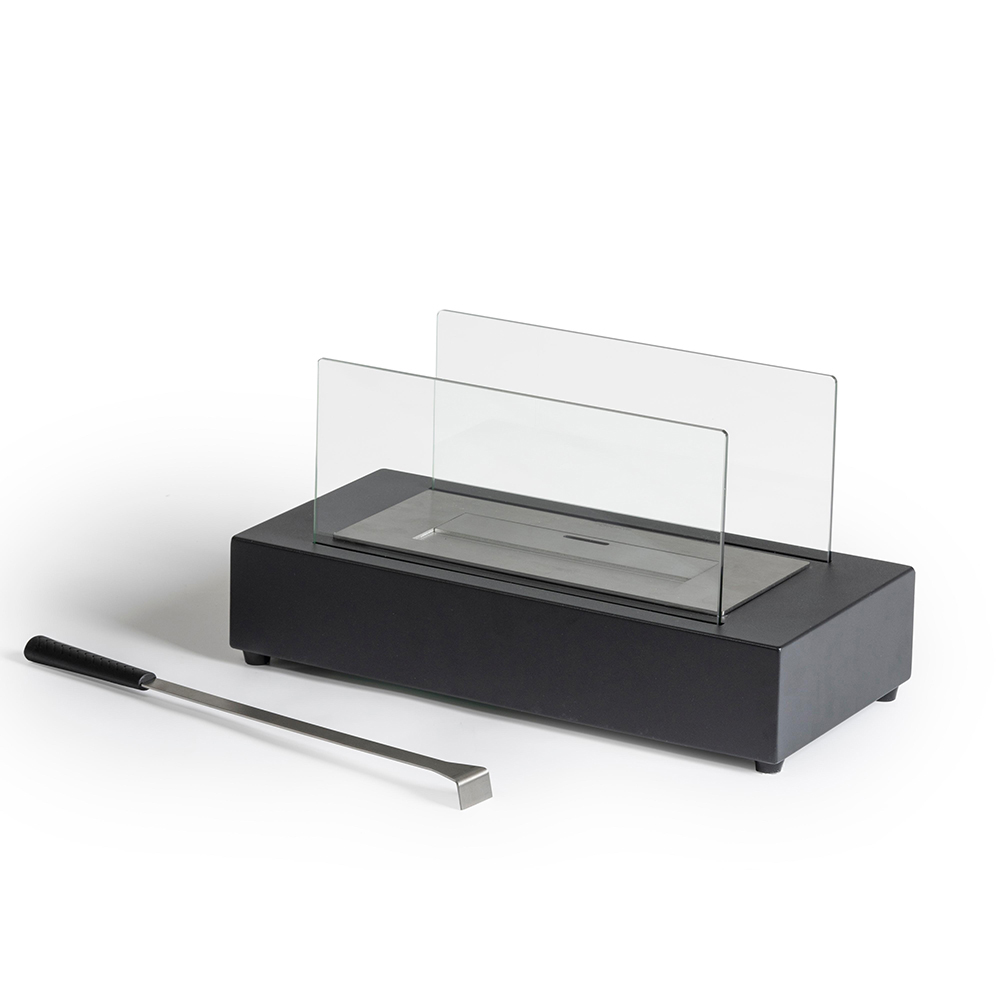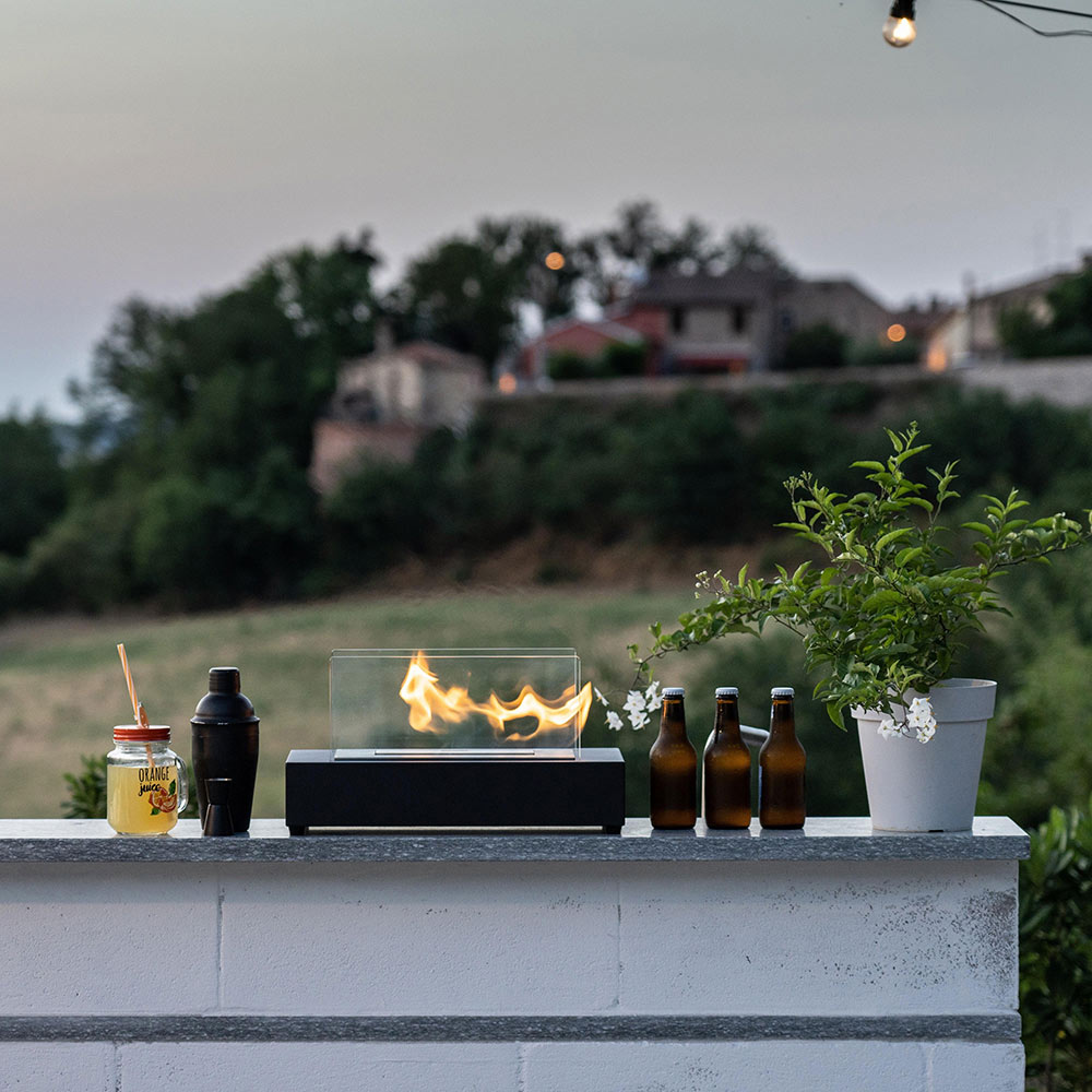 Biochimenea de suelo o de sobremesa con estructura de metal pintado de color negro y un inserto de cristal templado transparente útil para proteger la llama de posibles ráfagas de viento, resaltándola. Incluye herramienta de control de llama y manual de instrucciones. Un objeto de pequeñas dimensiones ideal para calentar ambientes domésticos y contract tanto en interiores como en exteriores de forma funcional y elegante . Su diseño exclusivo la convierte en una opción ideal para espacios interiores y exteriores. También se aprecia cuando está apagado, ya que completa el espacio circundante a través de un Un toque de estilo refinado y elegante .