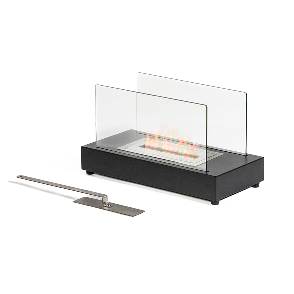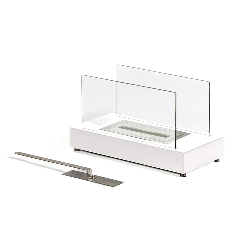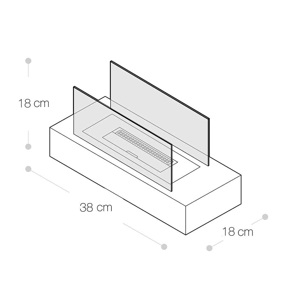 La estructura es de metal y el cristal templado protege la llama de posibles ráfagas de viento, resaltándola; esto también lo hace adecuado para entornos al aire libre.
