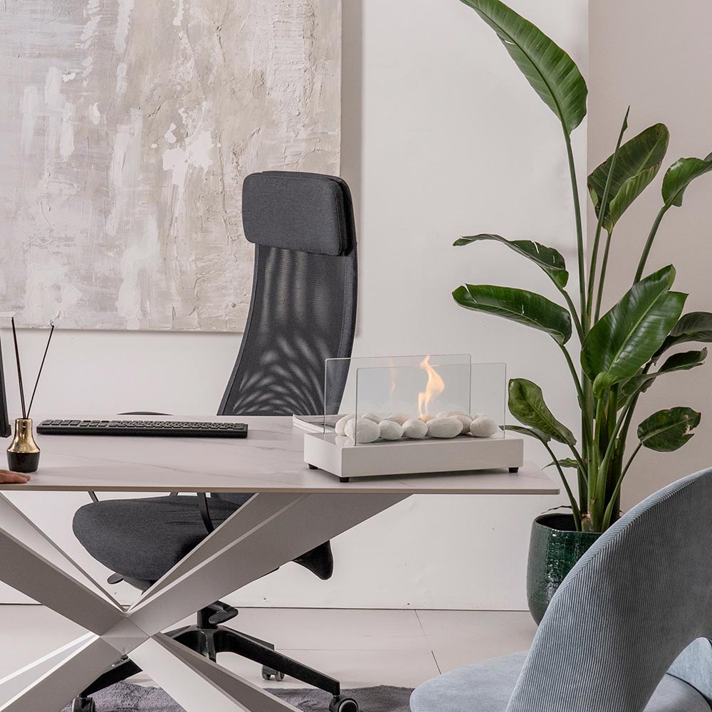 Chimenea de sobremesa de bioetanol con un diseño único. La plata es una pieza exclusiva que no puede faltar en tu hogar.
