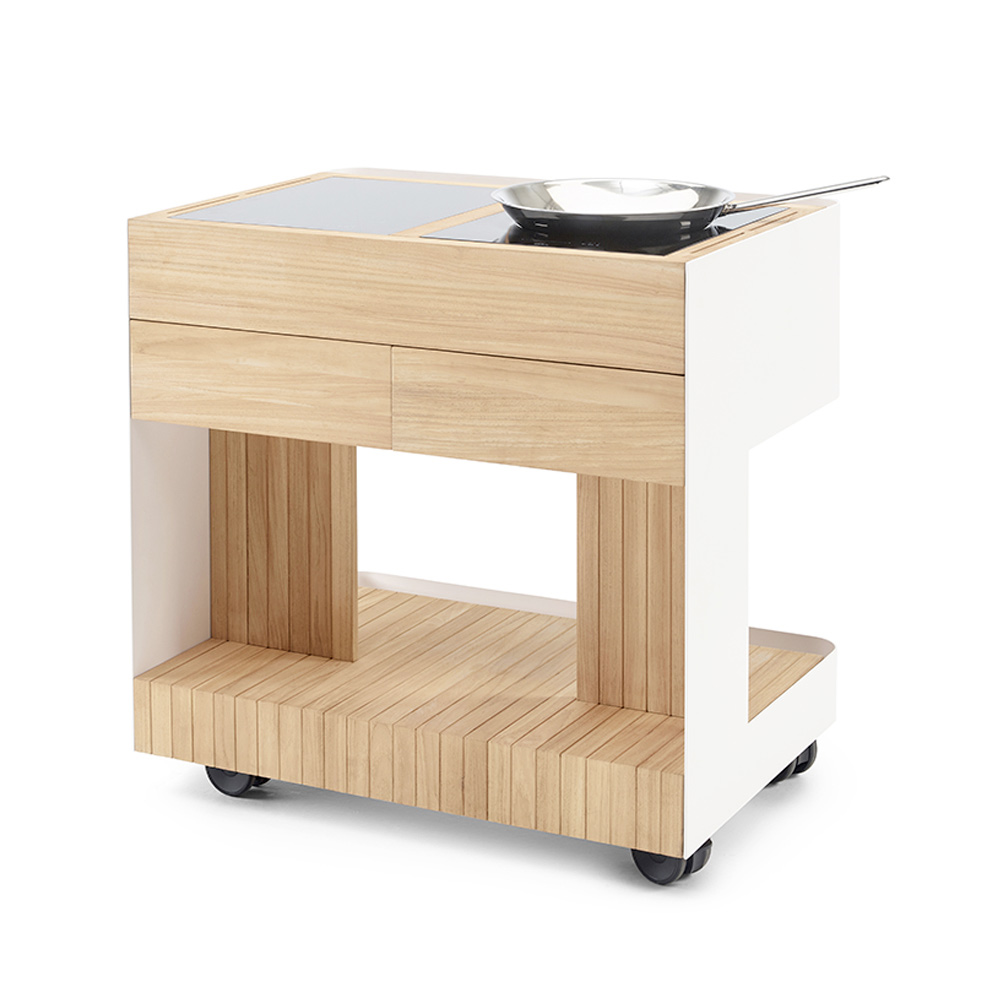 Esta cocina de exterior representa la mezcla perfecta de funcionalidad y diseño contemporáneo, ideal para convertir cada momento al aire libre en una experiencia única. La estructura de aluminio con recubrimiento de polvo ofrece robustez y resistencia a la intemperie, mientras que las inserciones de teka maciza de alta calidad tratadas con Rubio Monocoat Hybrid Wood Protector añaden un toque de elegancia natural y calidez visual.