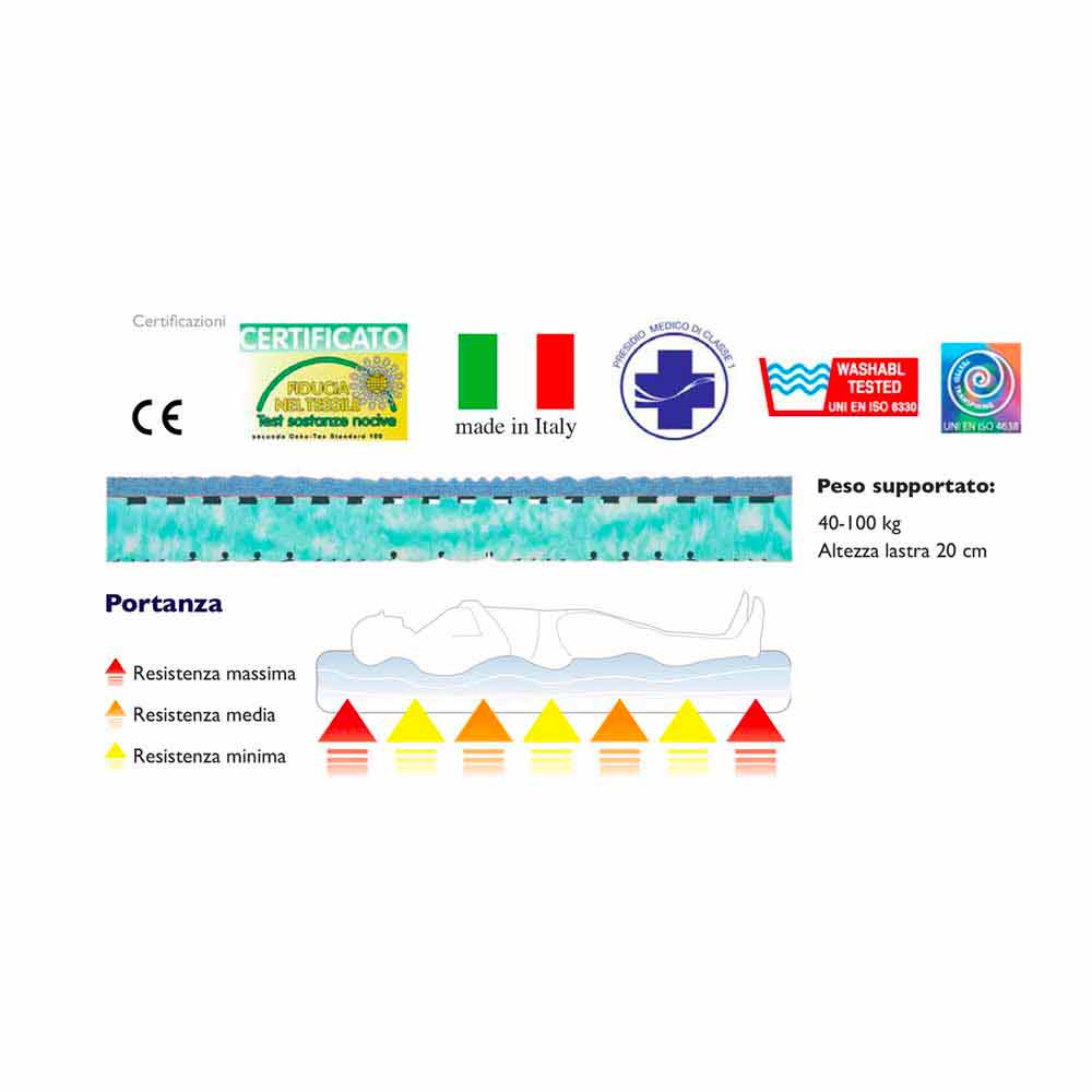 La mejor transpirabilidad también está garantizada por el perfil particular y de los agujeros que se unen la Memoria a la capa de espuma de "Nature" que apoya en un peso corporal adecuado y eficaz, esto también forma en la parte inferior para facilitar el uso de este producto en las redes mecanizada.