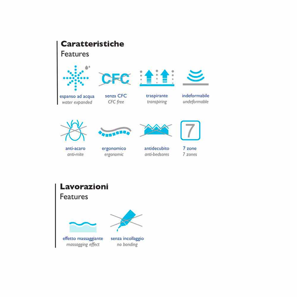 La mejor transpirabilidad también está garantizada por el perfil particular y de los agujeros que se unen la Memoria a la capa de espuma de "Nature" que apoya en un peso corporal adecuado y eficaz, esto también forma en la parte inferior para facilitar el uso de este producto en las redes mecanizada.